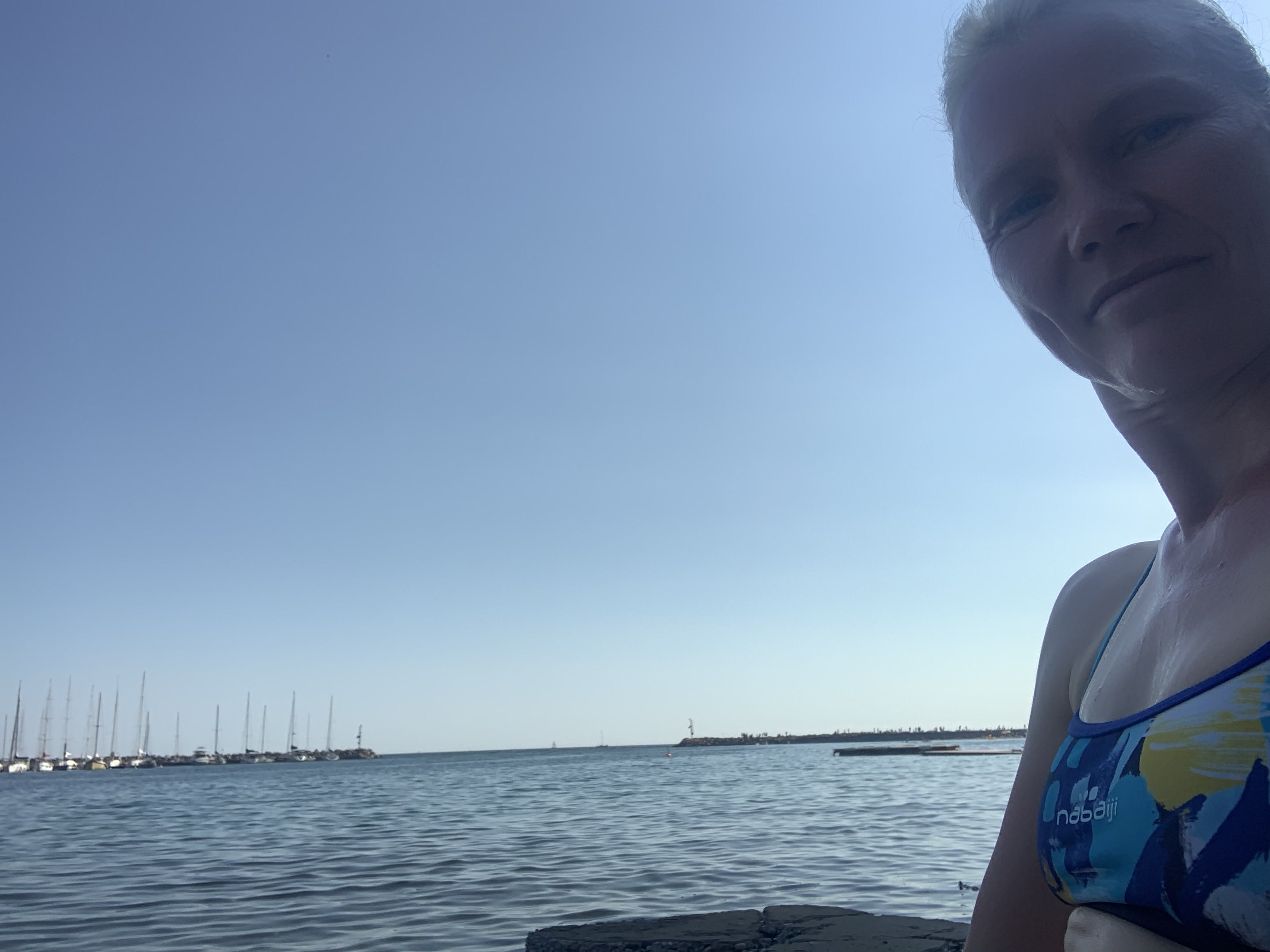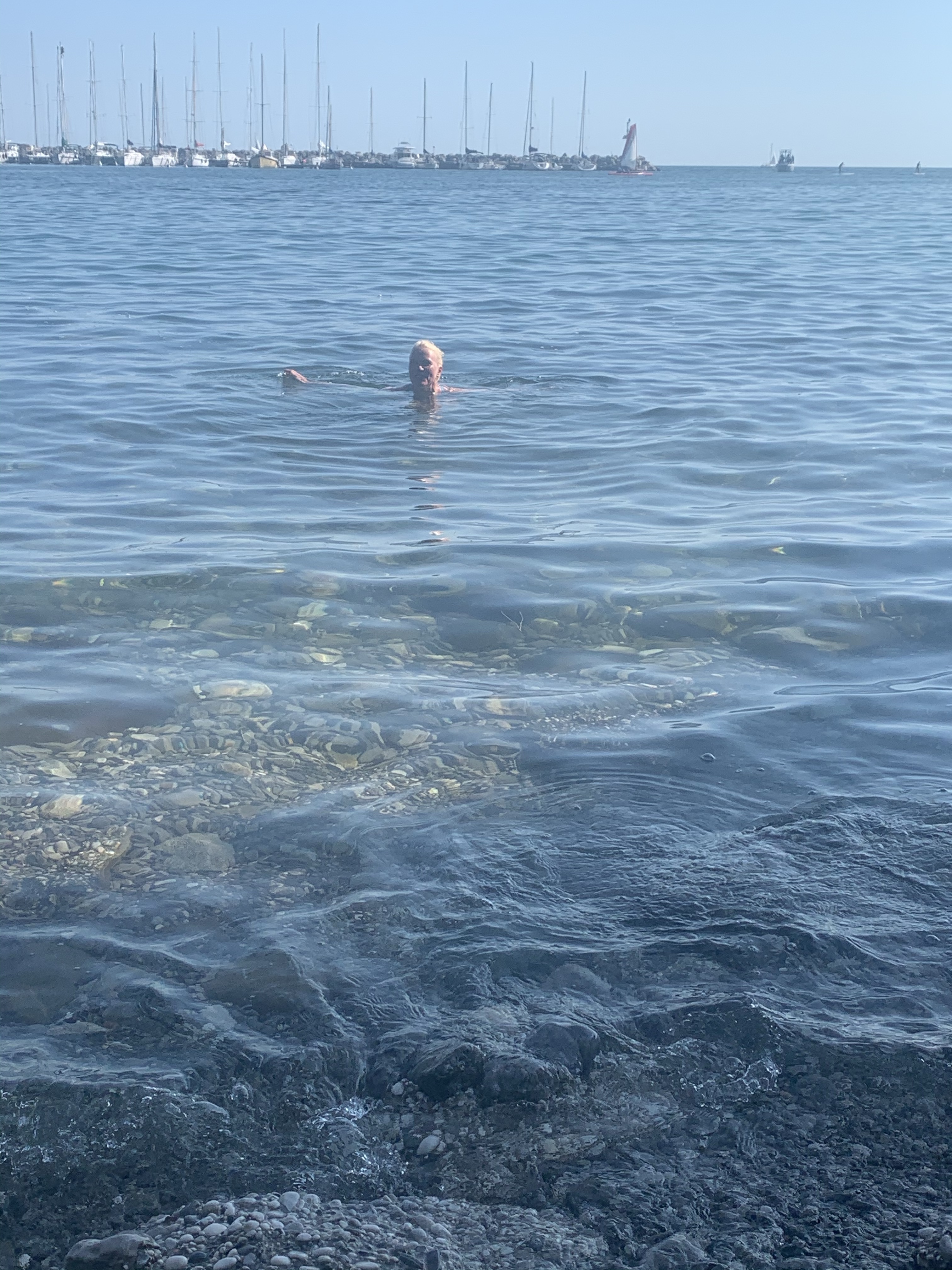 Die ersten beiden Tagen sind wir zum Meer runter gefahren und Martin ist schön entspannt im Meer raus geschwommen, Sigrid hat sich am ersten Tag einen Zeh und Finger angeritzt und am zweiten Tag den Oberschenkel. Deshalb haben wir am dritten Tag mal den Pool ausprobiert. Die Bahnen waren schön gerade, es gab keine scharfen Steine, keine Fische oder Strömung: da blieb sie dann unverletzt 😊 Hier schmeißt sie für Pia einen Stein ins Meer 😅