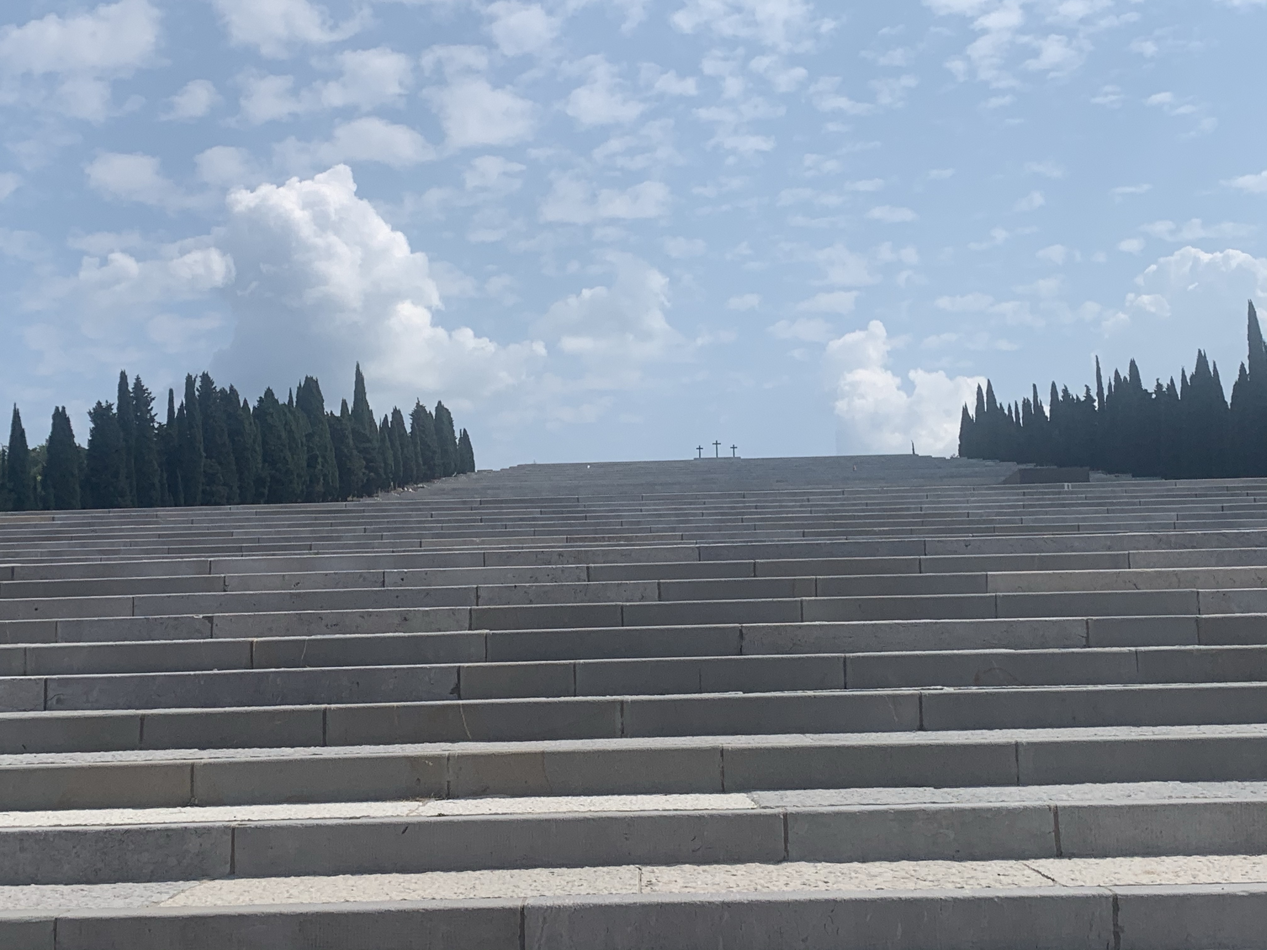 Den nächsten Tag schön aufs geliebte Rennrad, Kilometer machen ohne Höhenmeter. Haben bei Komoot eine schöne Tour gefunden, allerdings denken wir, dass der Rennradfahrer diese Tour am Sonntagmorgen um 6 Uhr startet. Wir sind kurz nach 7 Uhr los und in der Woche fahren natürlich die Menschen da zur Arbeit. Der italienische Auto- oder LKW-Fahrer übt sich permanent darin, maximal 10 bis 30 cm Abstand zu halten. Das fühlt sich für den Radfahrer sehr eng an 🤔 Die Strecke war wunderschön 😊 Auf halben Weg einen Kaffee und ein paar Brioche und weiter geht es, mittlerweile bei Temperaturen bis 38 Grad 😅 Da schwitzen wir doch ein wenig 😎 und müssen sogar noch mal Wasser kaufen, um die Flaschen nachzufüllen. Die Ausblicke so wunderschön, die Dörfer malerisch und sogar noch etwas geschichtliches entdecken. Alles war drin 😊