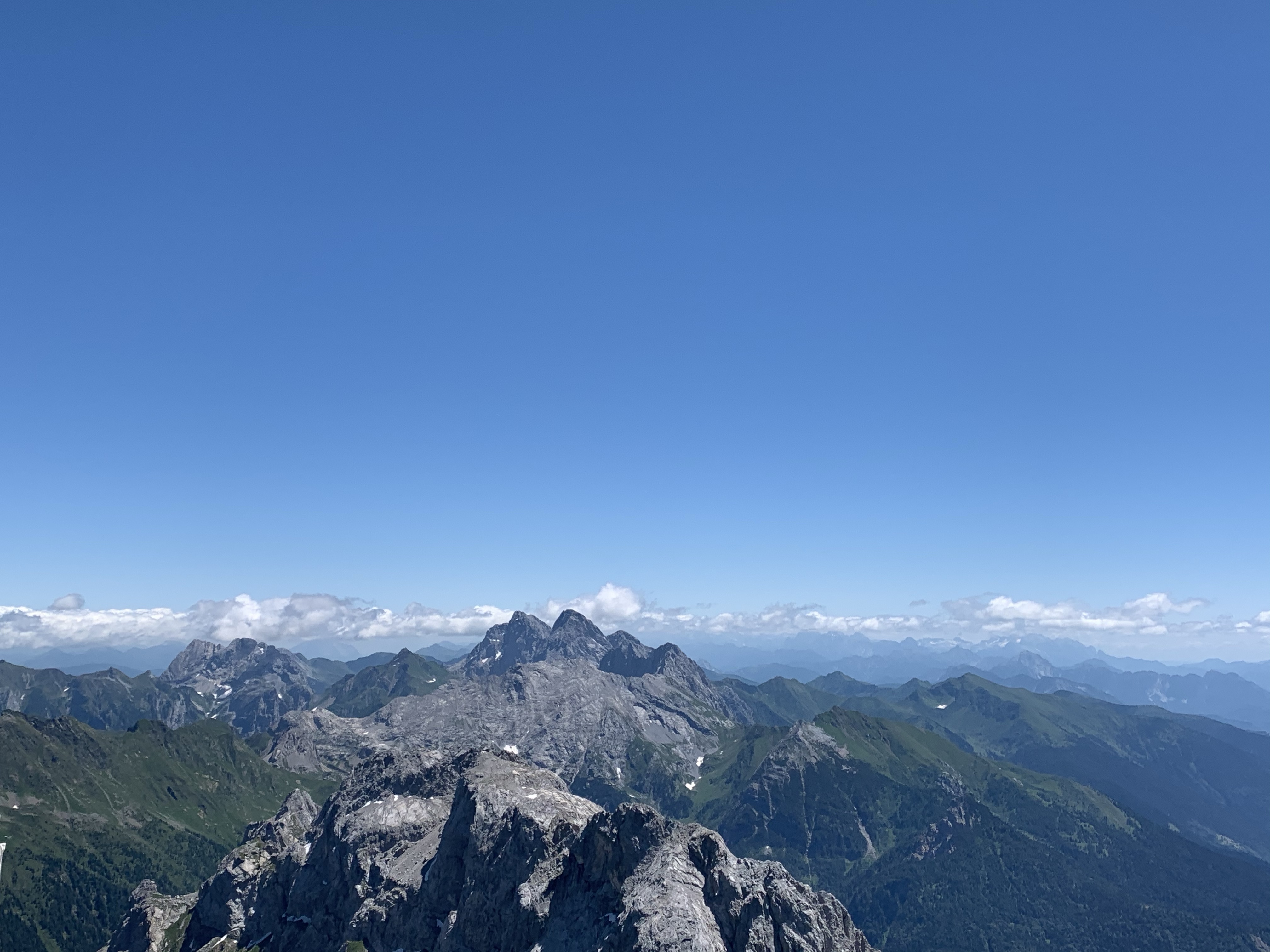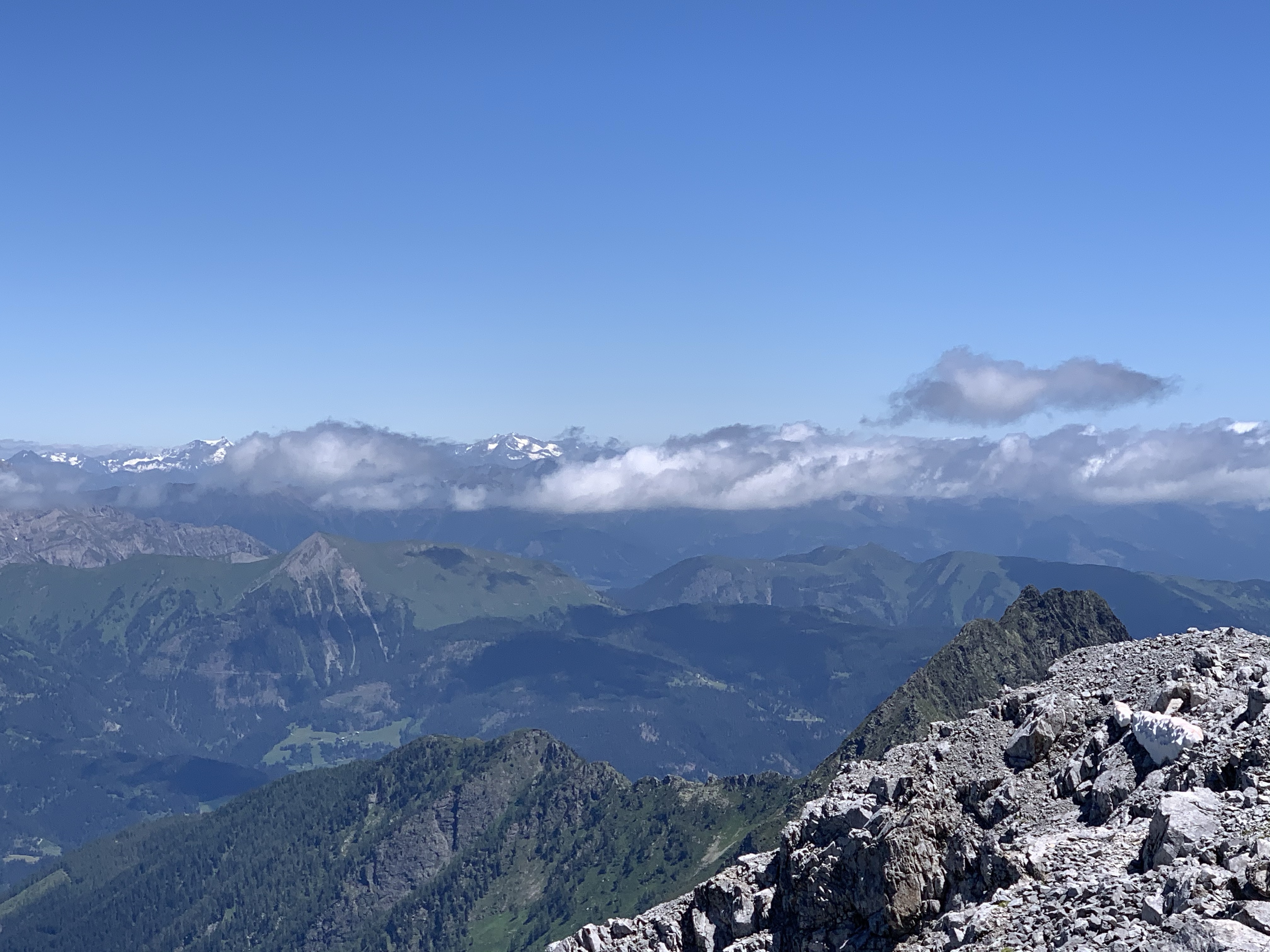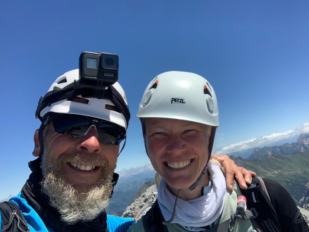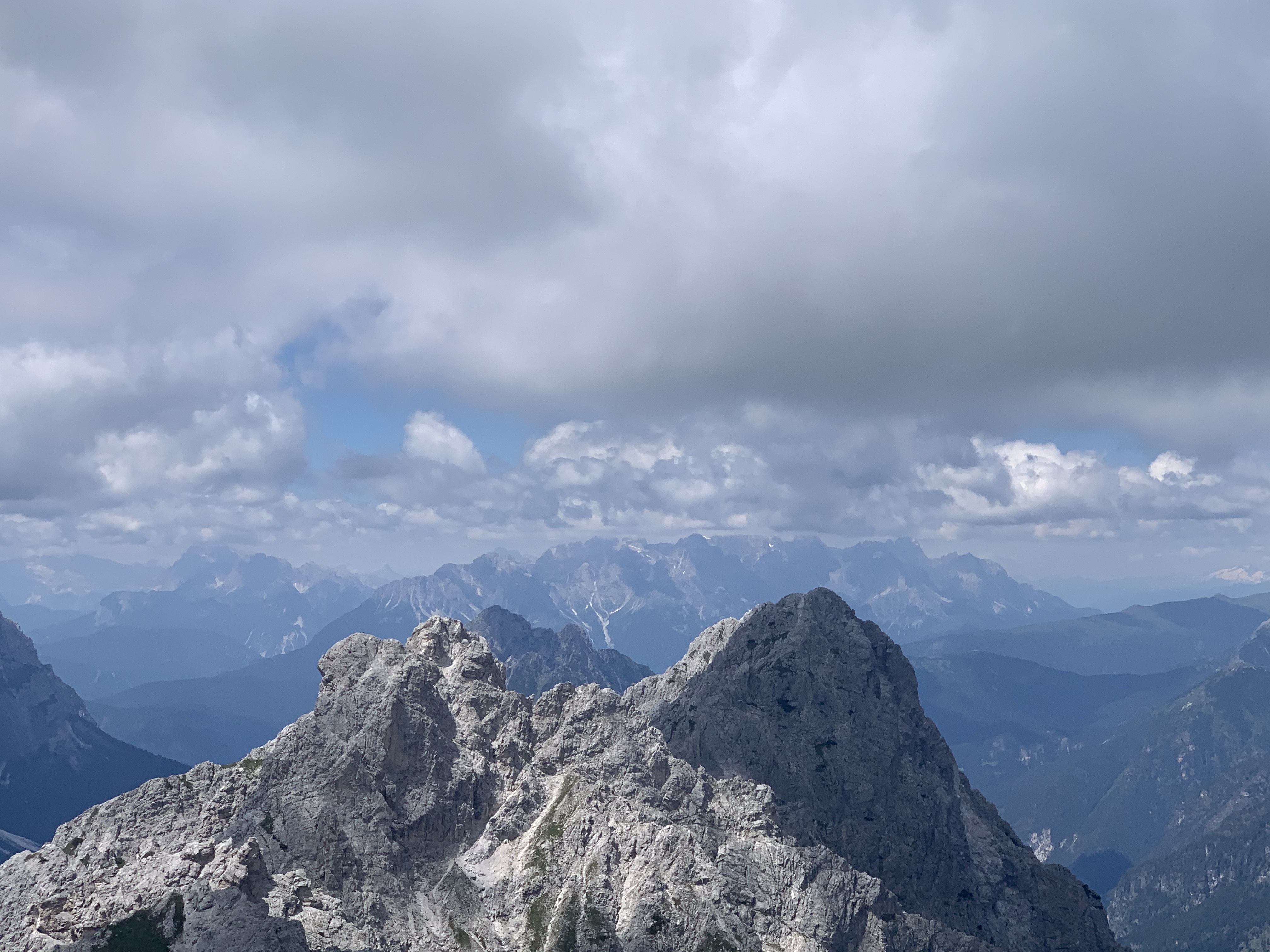 Diesmal haben wir uns für einen Klettersteig entschieden, allerdings ging es vom Parkplatz erst noch mal eine Stunde hoch zur Hütte, um von da aus dann einsteigen zu können. Die Stunde dauerte für uns genau 32 Minuten und schon waren wir da. Wir kriegen das irgendwie einfach nicht hin, uns an die Regeln zu halten 😅 Da wir noch soviel Zeit hatten, haben wir in der Hütte noch einen Espresso getrunken. Der Wirt war wahrscheinlich genauso alt wie seine Hütte. Dafür war die Hütte aber besser in Schuss als der Wirt. Schwer humpelte er durch seine sehr gemütliche Hütte, der Espresso war perfekt. Auf den Schwarz-Weiß-Bildern an der Wand wirkte er auch schon alt oder er war seinem Großvater aus dem Gesicht geschnitten. Das haben wir aber nicht gefragt 😀 Nach dem Kaffee und Toilettengang gingen wir dann weiter zum Einstieg. Da angekommen ist ein Trio gerade los geklettert, wobei der letzte vermutlich seine erste Tour machte. Wir haben uns dann gemütlich hingesetzt und die Aussicht genossen und sind nach gut 10 Minuten auch hinauf. Ein schöner Steig ohne große Schwierigkeiten und ziemlich schnell waren wir dann schon oben. Die Aussicht vom Gipfel war einfach genial, sie ging weit nach Österreich und Italien hinein.