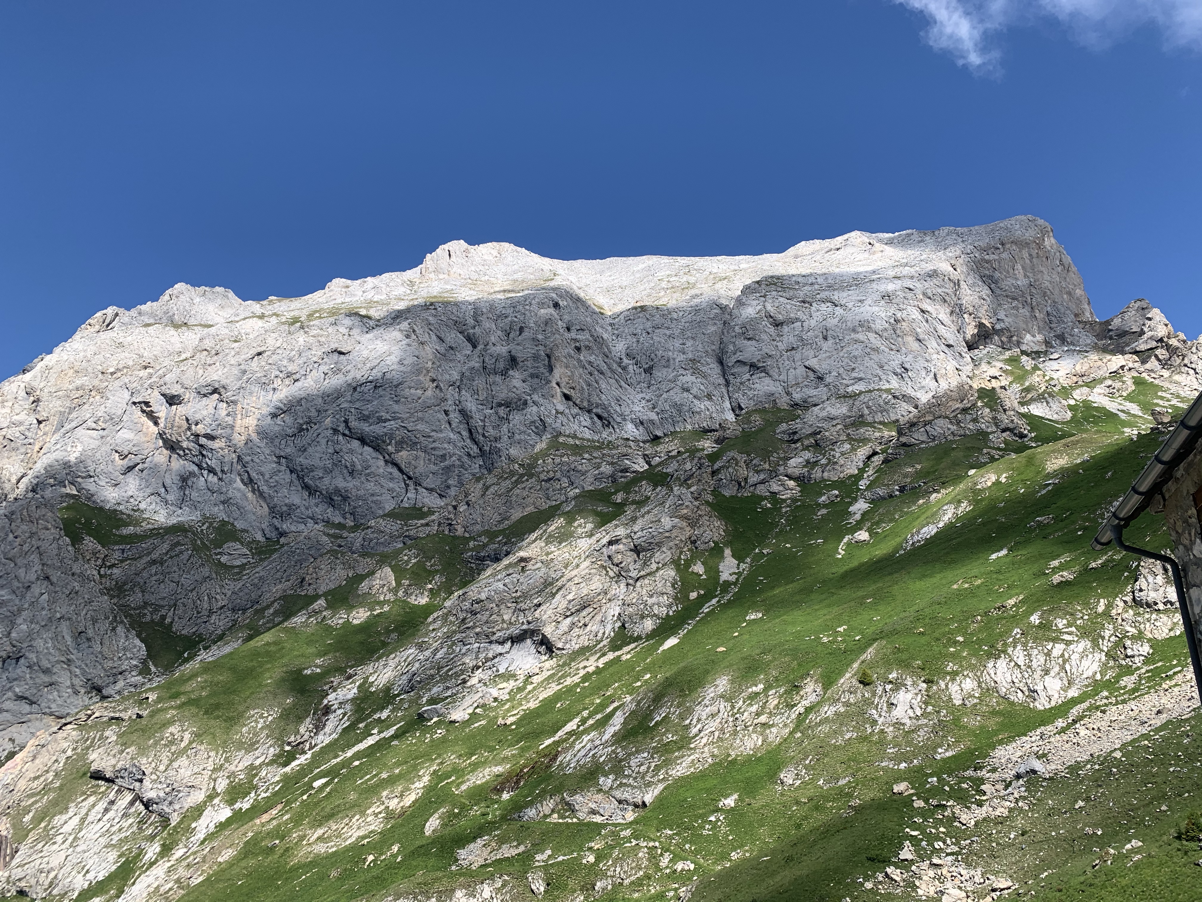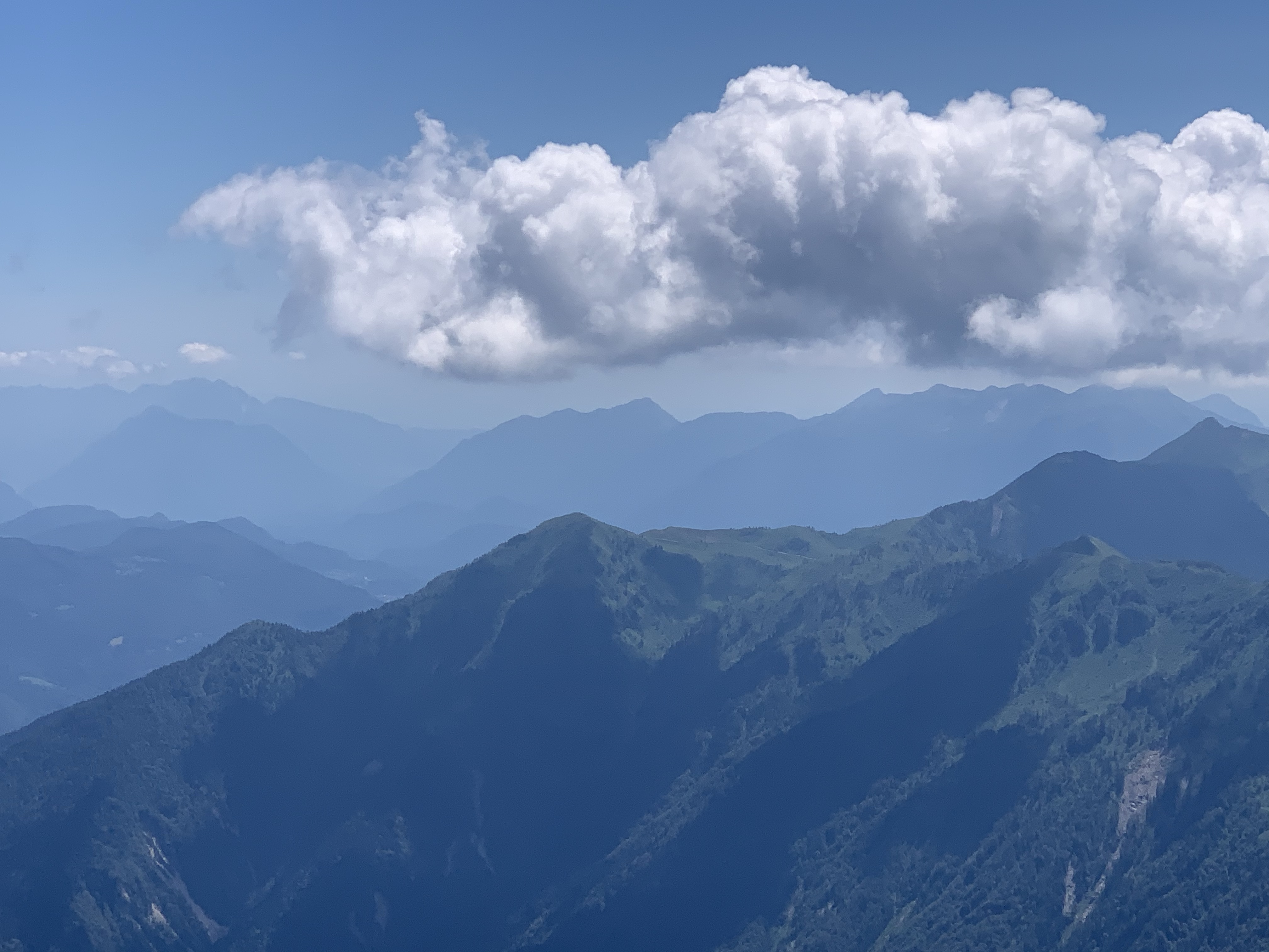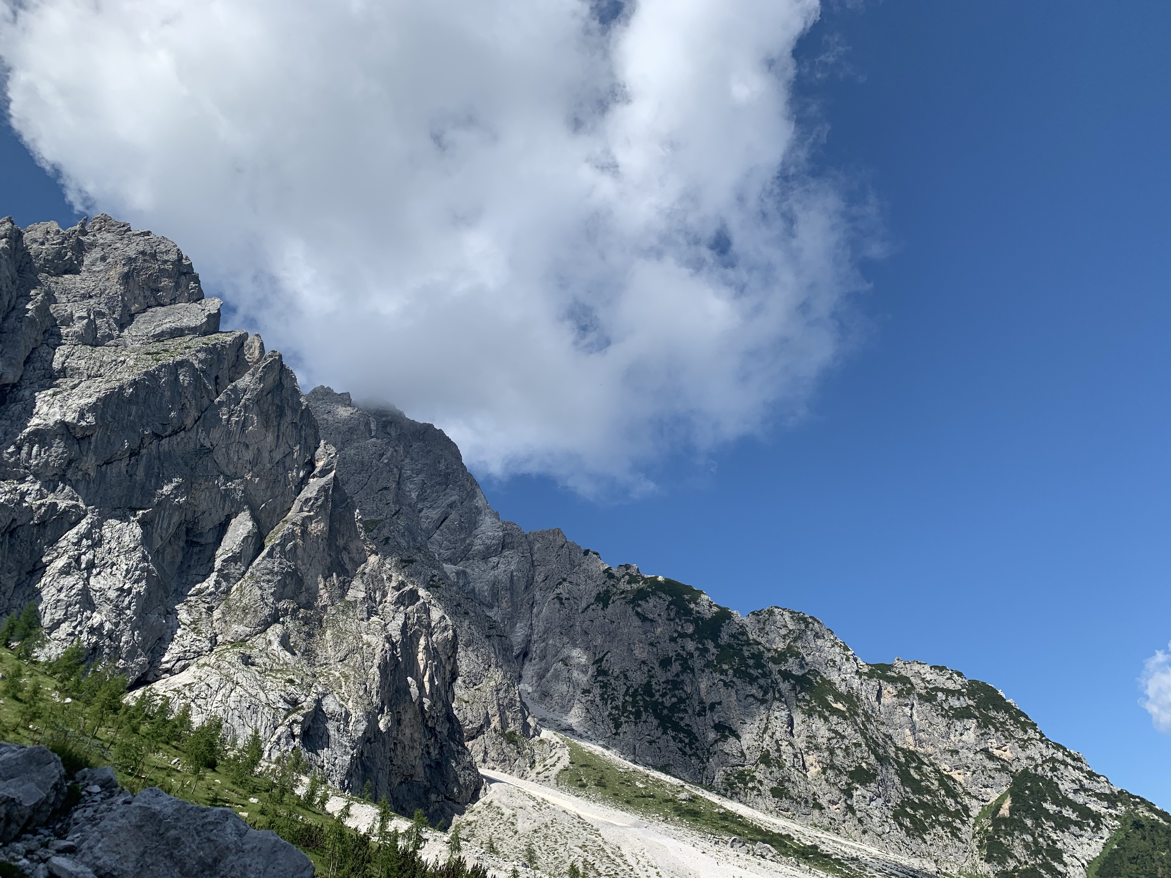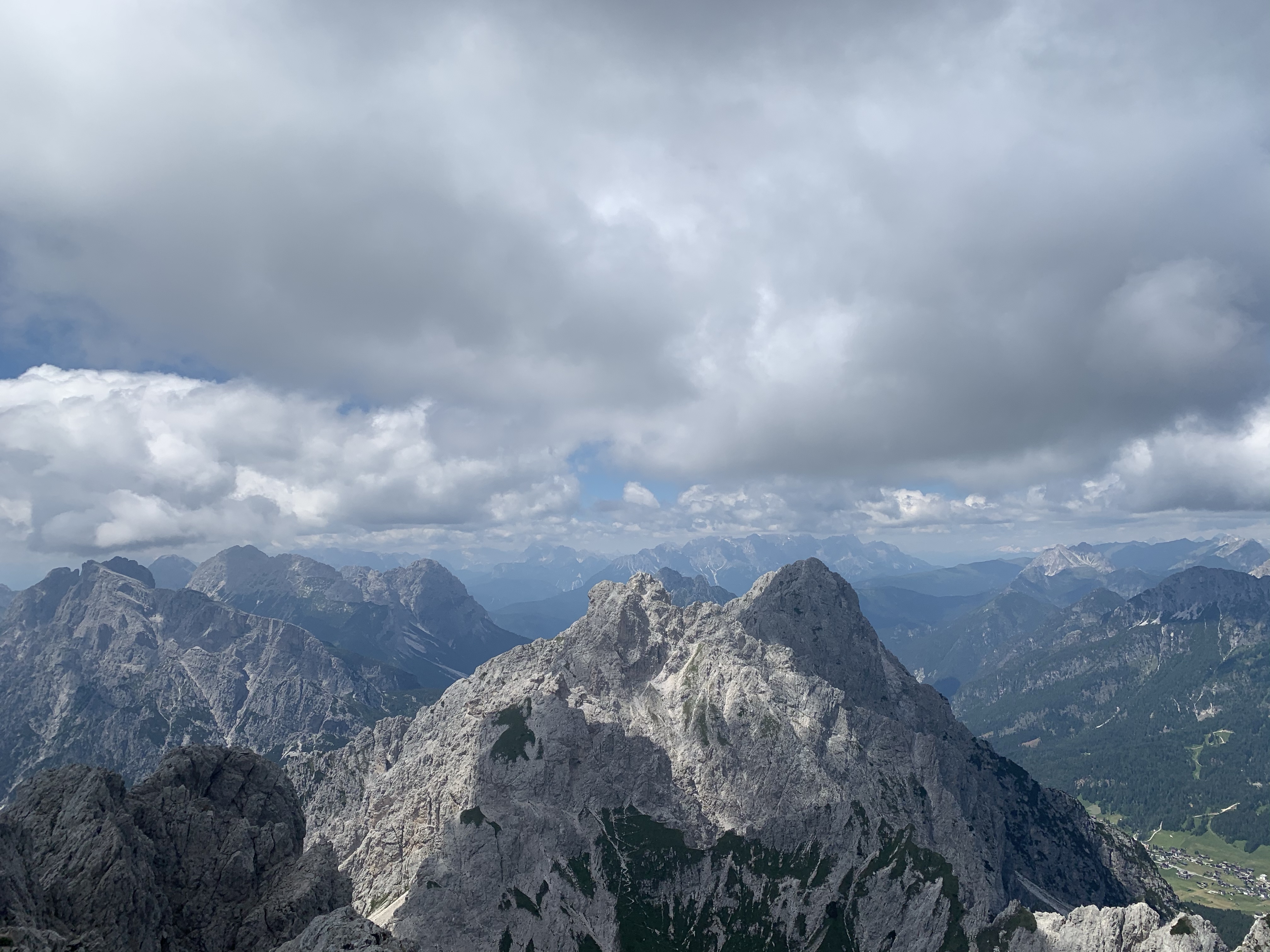 Diesmal haben wir uns für einen Klettersteig entschieden, allerdings ging es vom Parkplatz erst noch mal eine Stunde hoch zur Hütte, um von da aus dann einsteigen zu können. Die Stunde dauerte für uns genau 32 Minuten und schon waren wir da. Wir kriegen das irgendwie einfach nicht hin, uns an die Regeln zu halten 😅 Da wir noch soviel Zeit hatten, haben wir in der Hütte noch einen Espresso getrunken. Der Wirt war wahrscheinlich genauso alt wie seine Hütte. Dafür war die Hütte aber besser in Schuss als der Wirt. Schwer humpelte er durch seine sehr gemütliche Hütte, der Espresso war perfekt. Auf den Schwarz-Weiß-Bildern an der Wand wirkte er auch schon alt oder er war seinem Großvater aus dem Gesicht geschnitten. Das haben wir aber nicht gefragt 😀 Nach dem Kaffee und Toilettengang gingen wir dann weiter zum Einstieg. Da angekommen ist ein Trio gerade los geklettert, wobei der letzte vermutlich seine erste Tour machte. Wir haben uns dann gemütlich hingesetzt und die Aussicht genossen und sind nach gut 10 Minuten auch hinauf. Ein schöner Steig ohne große Schwierigkeiten und ziemlich schnell waren wir dann schon oben. Die Aussicht vom Gipfel war einfach genial, sie ging weit nach Österreich und Italien hinein.