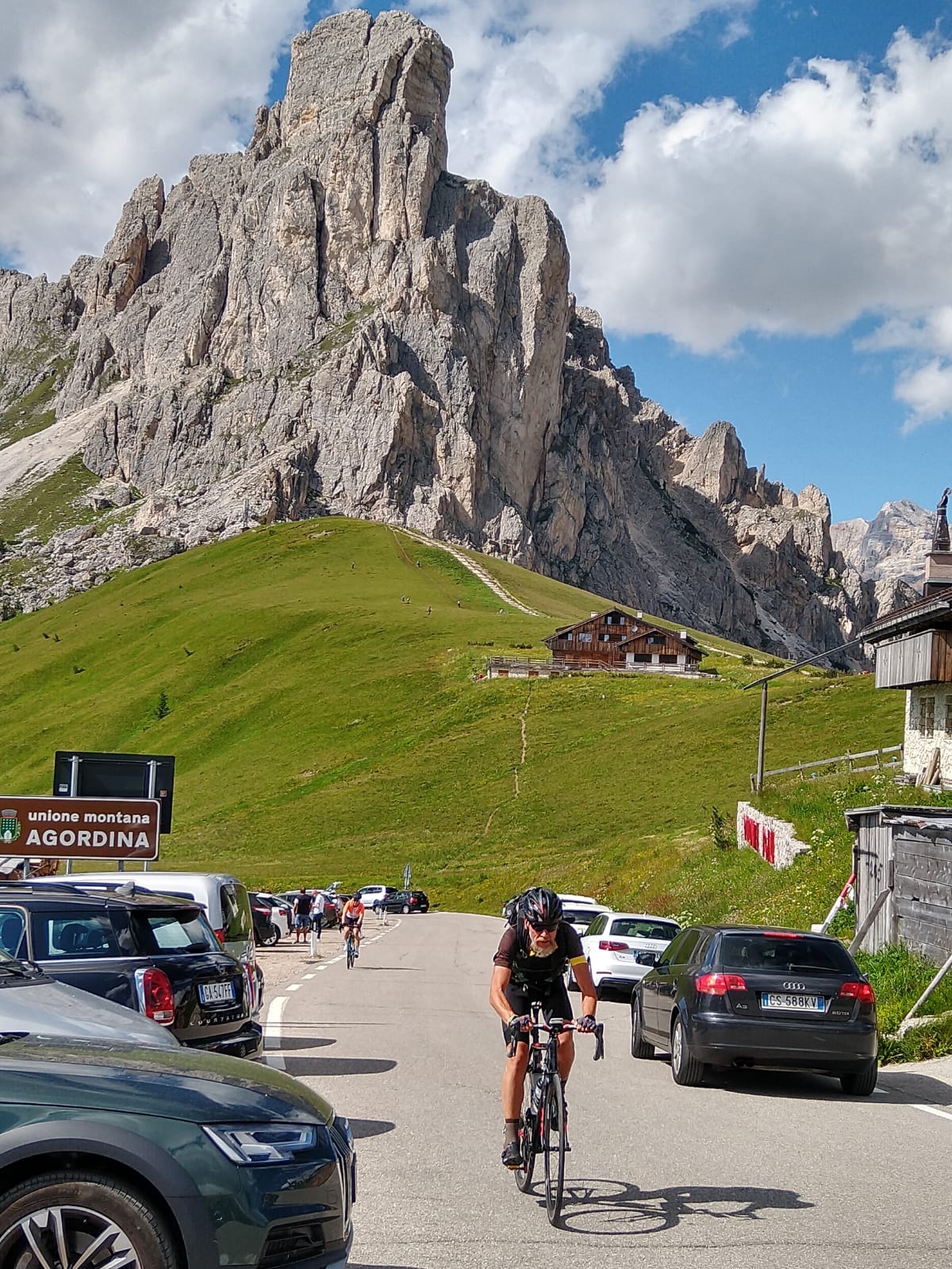 Die Abfahrt vom Falzarego gab schon einen guten Vorgeschmack auf das, was nach unten so möglich ist… Nach gut 11 Km ist man unten und biegt ab zum Colle Santa Lucia (1480m). Man fährt auf 2,5 Km nochmal 185 Hm, nicht lang, aber doch schon im zweistelligen Prozentsatz. Oben auf „der Kuppe“ haben wir dann kurz was gegessen. An einem Tisch waren bei zwei älteren Radfahrern noch 2 Plätzchen frei. Der optisch etwas älter wirkende erzählte uns, dass er einige Jahre in Düsseldorf gewohnt hatte und berichtete über die nicht gute Arbeit Untertage. Immer wieder nett so kurze Begegnungen. Nach einem Kaffee und einem Stück Apfelstrudel geht es dann weiter zum Passo di Giau (2233m)