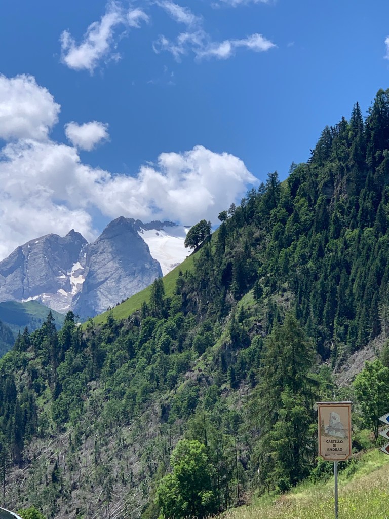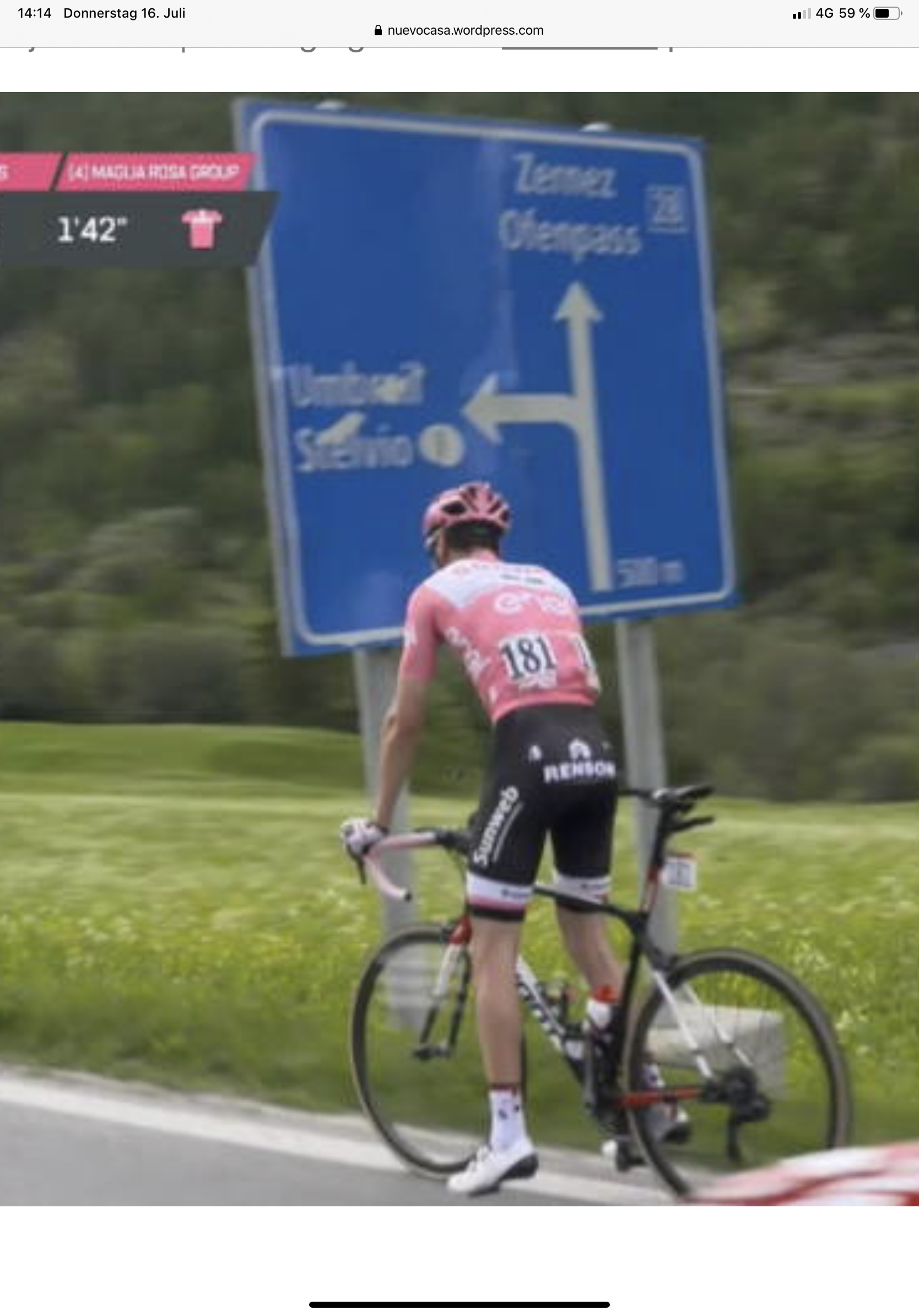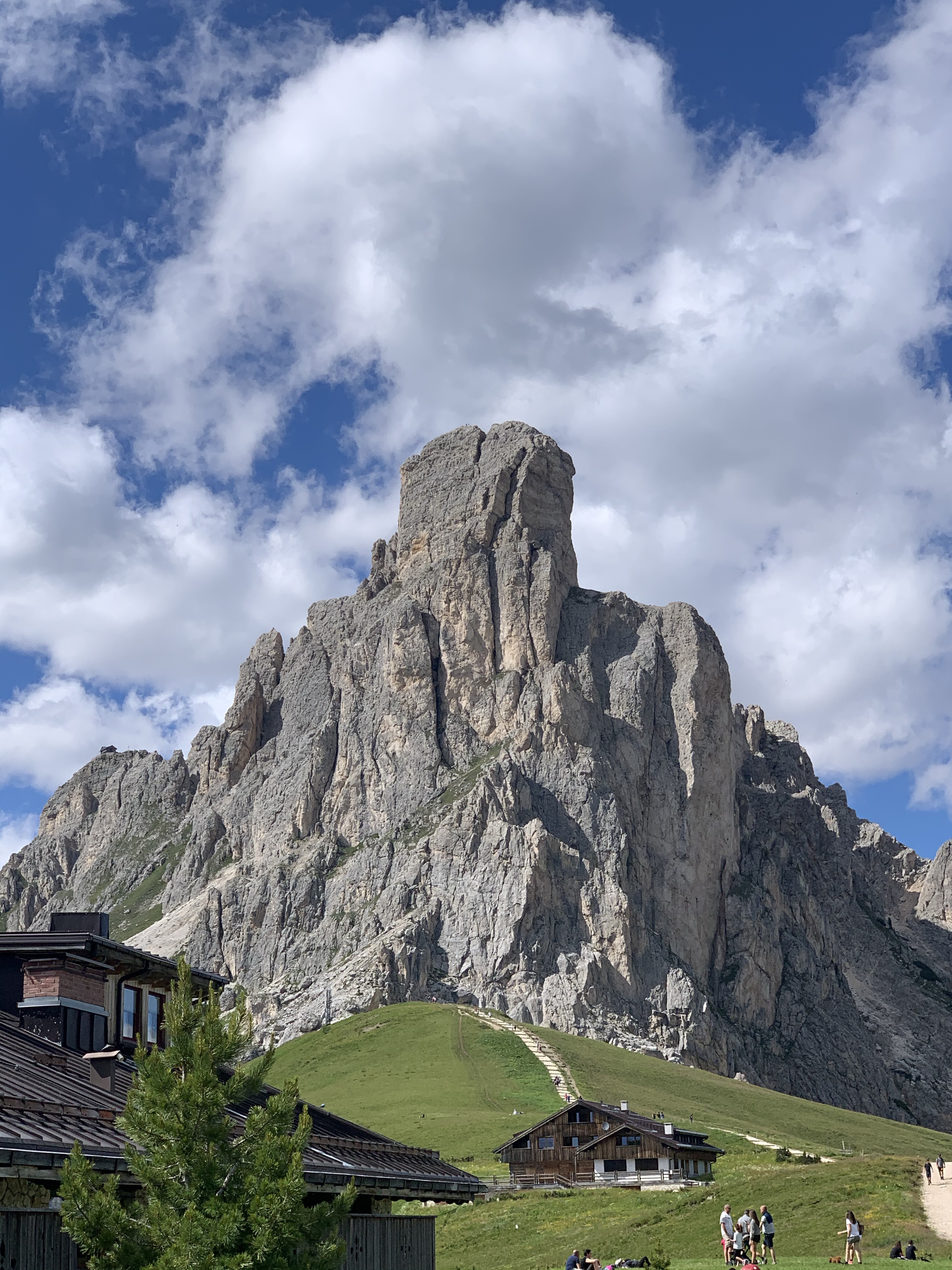 Passo di Giau 9,5 Km lang und 849 Hm. Die Sonne brennt mittlerweile ganz schön und der Schweiß fließt. Der Anstieg fängt an mit einer 300 m langen Rampe, die einen sofort spüren lässt, dass man vorher auch schon was getan hat. Nach ca 2 Km trifft es dann Martin, ein Tom Dumoulin-déjà-vu. Runter vom Rad und ab ins Gebüsch, Trikot aus, Hose runter, laufen lassen und zugucken, wie die Verfolger an einem vorbeifahren. Dann wieder zurück aufs Rad und die Verfolgung wieder aufnehmen… Sch… nochmal vom Rad und die gleiche Prozedur … Etwas mehr Zeit gegönnt und wieder rauf aufs Rad. Erstmal Druck machen mit den Beinen. Ups, da bahnt sich ein Krampf an. Also wieder runter vom Rad und entspannen, Sigrid eine kurze Nachricht schreiben, dass es etwas länger dauert und dann wieder rauf aufs Rad. Jetzt die letzten 4 Km die Krämpfe unterdrücken und die Steigungsprozente ignorieren. Das funktioniert ganz gut bis man den letzten Km dann doch noch ein paar Spielkameraden sieht, die einem hochpushen zu seiner Freundin, die gefühlt seit Stunden schon oben wartet 🙃
