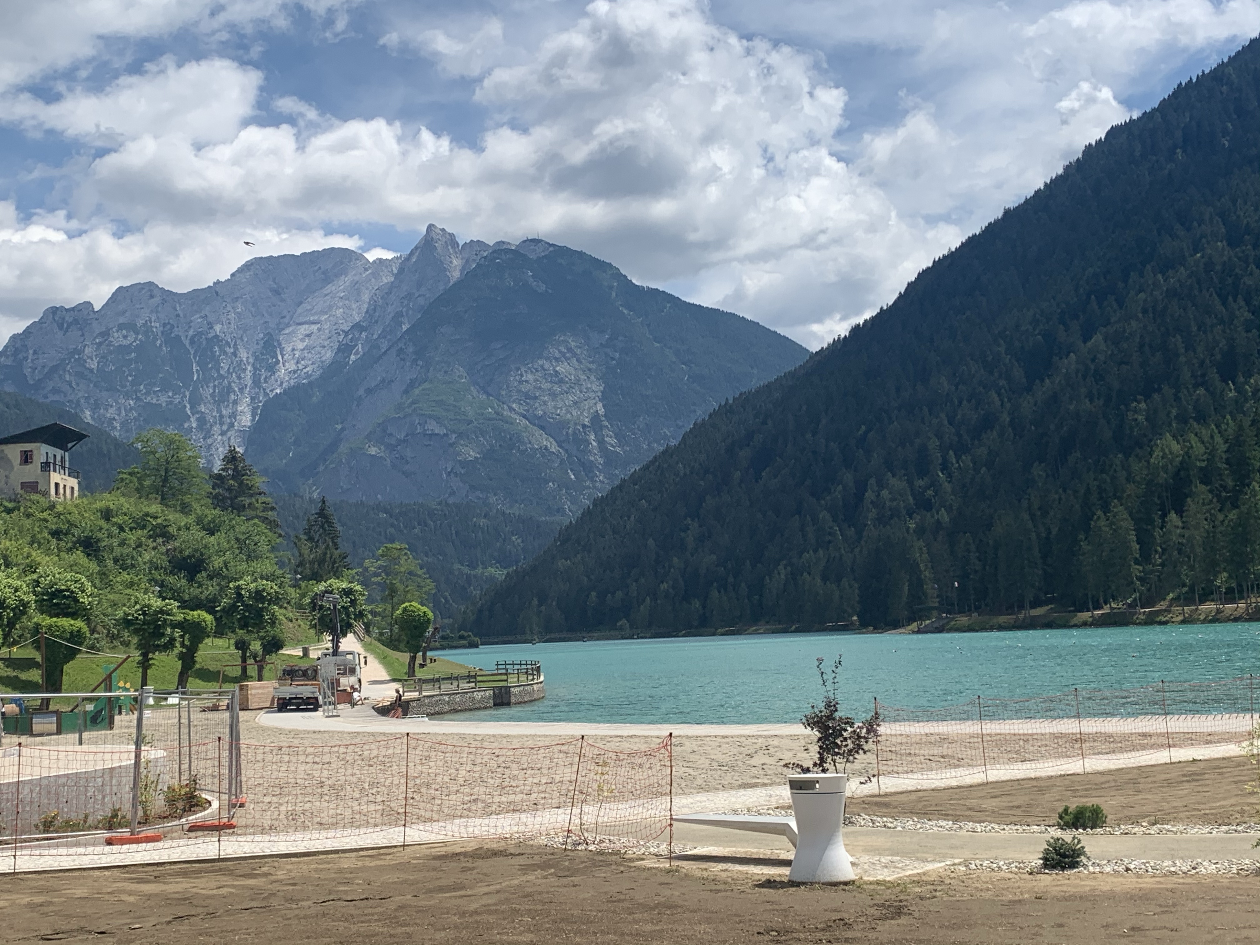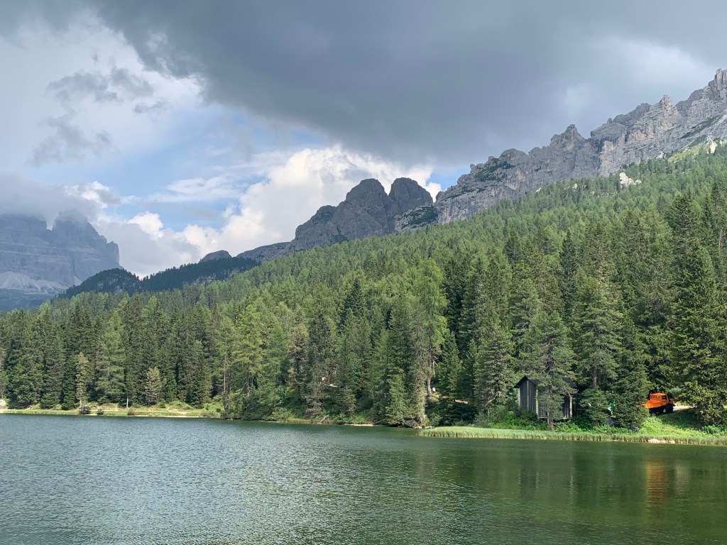 Die schwierigste Stelle absolviert, geht es dann erstmal ungefähr 30 Km hinunter. Nicht steil, aber doch ganz schön schnell. Da fragt man sich, ob die Kilometer nach oben doch viel länger sind als die nach unten 😉 Unten angekommen, machen wir eine kurze Pause am See Aurozo di Cadore und stärken uns für die letzten beiden Pässe.