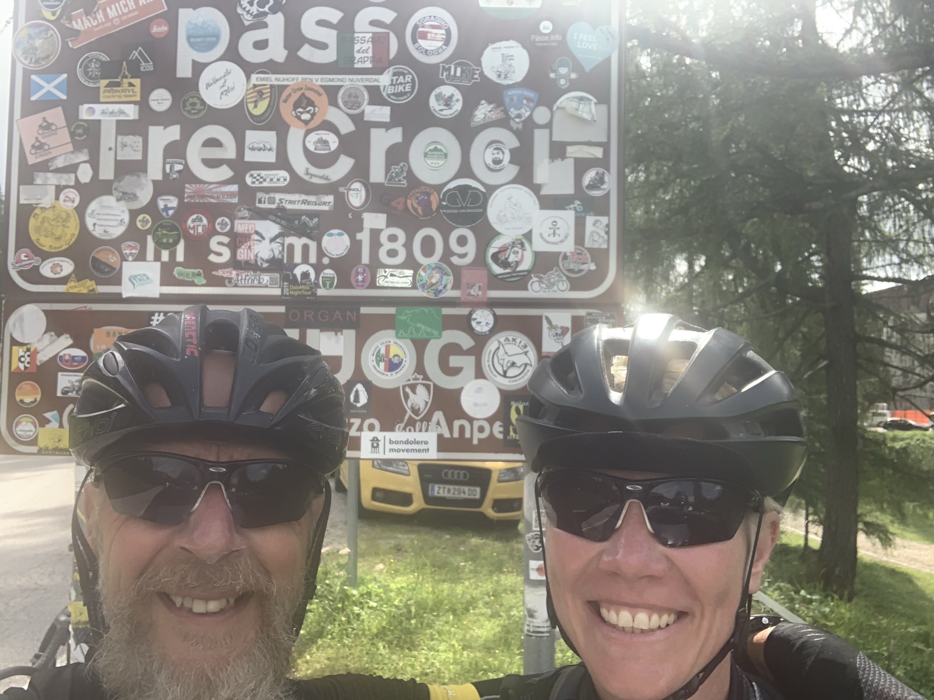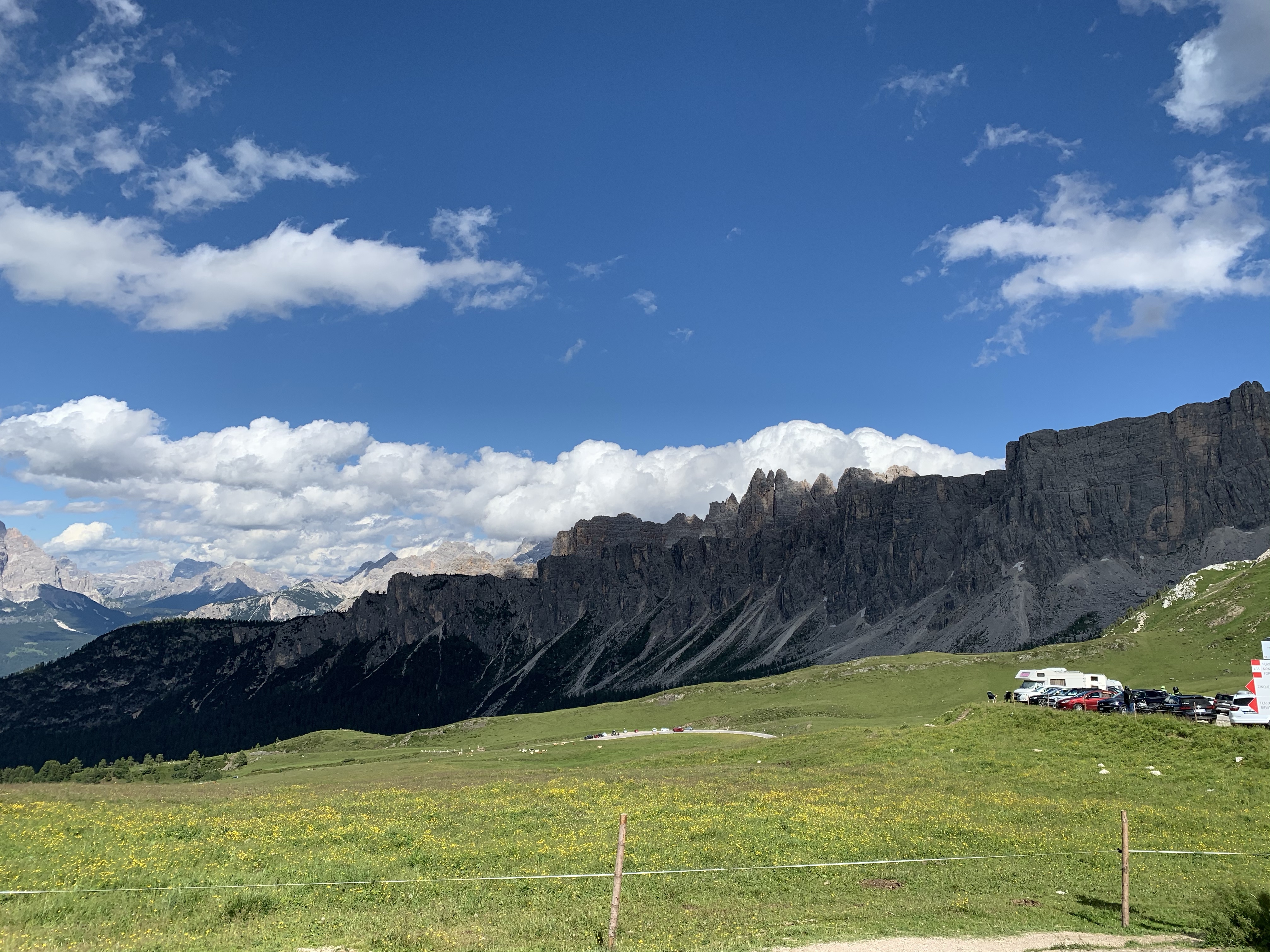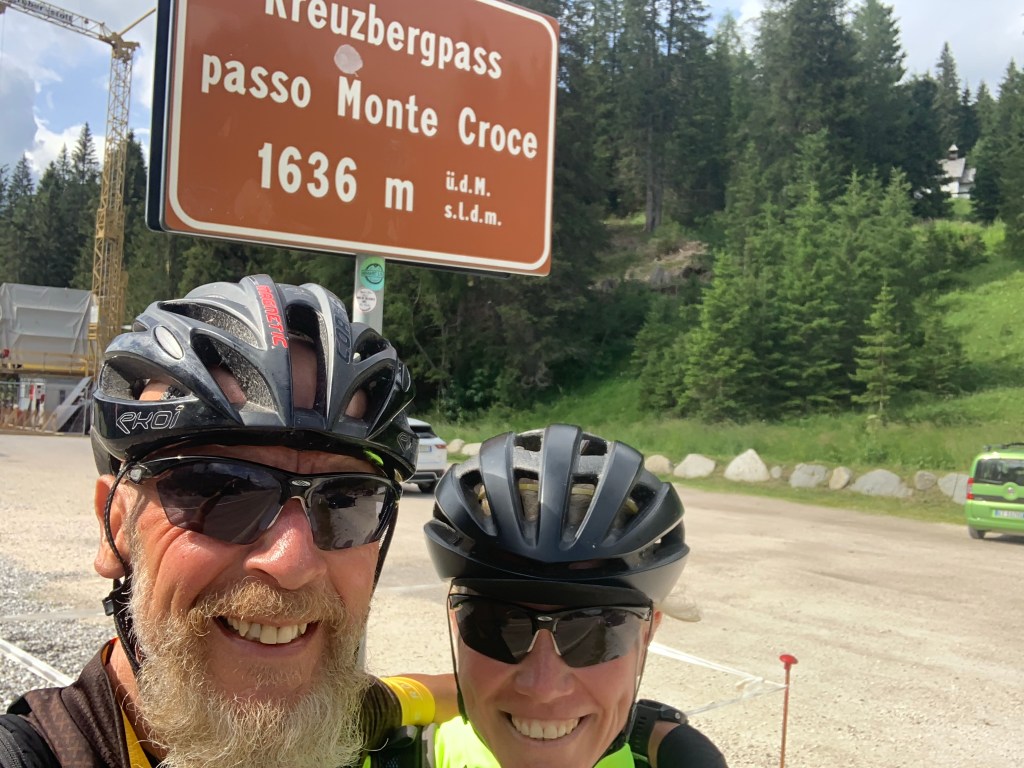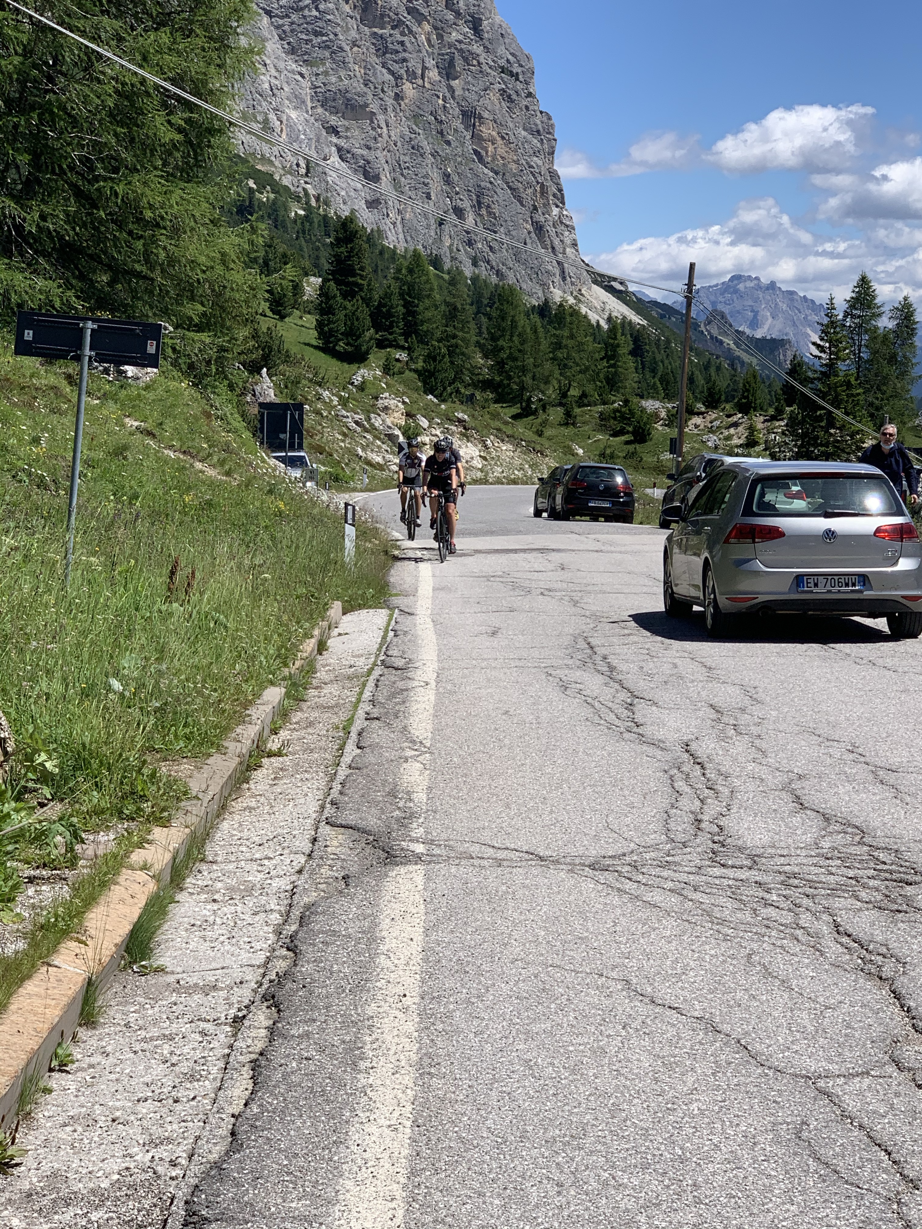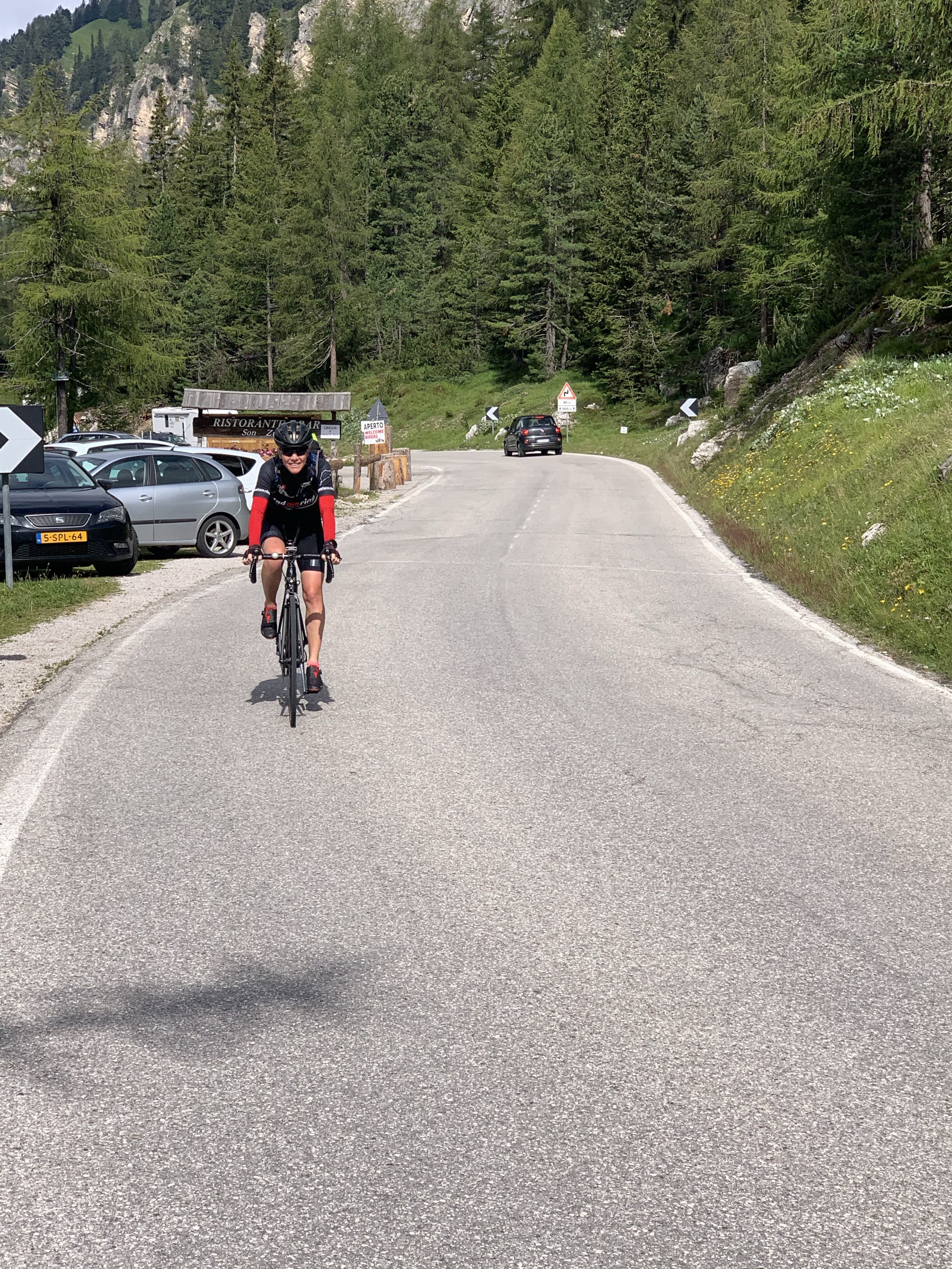 Nach dem Aufstieg folgt die Abfahrt nach Cortina d‘Ampezzo. Wir streifen den Ort kurz, um dann fast direkt in den Passo Falzarego (2105m) einzusteigen. Die Auffahrt ist 16 Km lang und wir machen dabei 900 Hm. Außer ein verrückter Porscheclub aus den Niederlanden und eine Gruppe mit historischen Vespafahrern konnten wir echt geniessen. Es gab einige andere Rennradfahrer am Berg und da kann es immer mal passieren, dass die Spielen wollen. Dann geht es wirklich gut voran. Sigrid hat dann „de achtervolgers“ im Schlepptau mit hochgebracht