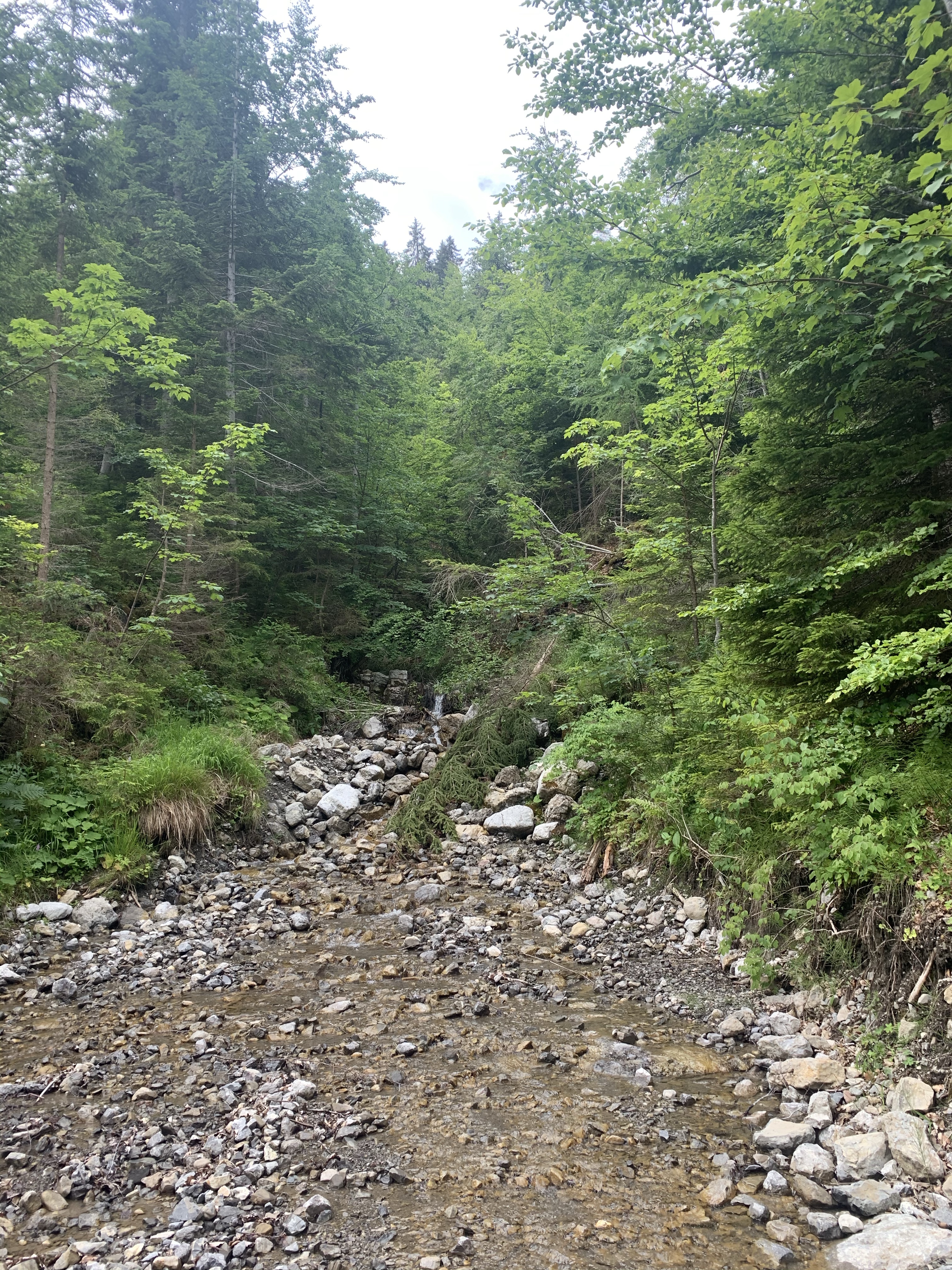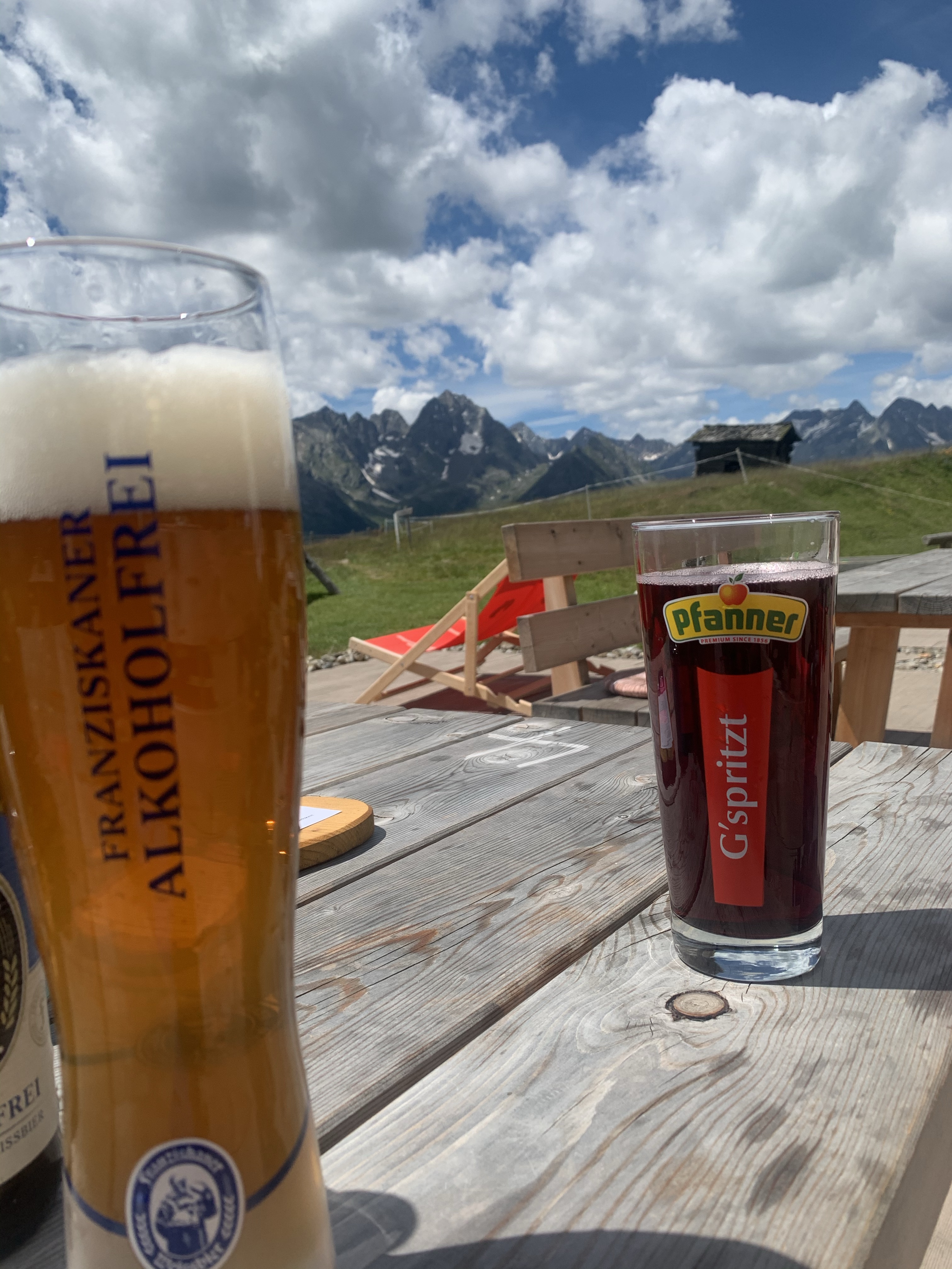 Gestärkt ging es dann weiter hoch in Richtung Karlsbaderhütte. Erst gut ausgebaut, später immer steiler und nur noch Kies, wir haben uns gewundert über Mitwanderer, die wie aus dem Ei gepellt angezogen waren. Familien, die auf Straßenschuhen, Hosen mit Bügelfalten und natürlich das langärmelige Businesshemd durfte nicht fehlen, unterwegs waren. Die halbe Literflasche Wasser wurde brüderlich geteilt und den Wanderweg schauten sie auf dem iPad an. Auf die Frage: Mama dauert es noch lange? hat Martin dann kurz geantwortet. Lang ist immer relativ, hängt davon ab wie schnell man geht. Wir haben ihnen dann die Länge in Kilometern und die noch zu überwindenden Höhenmeter vermittelt und sind dann weiter gegangen. Wir haben sie danach nicht mehr gesehen und vermuten das sie umgekehrt sind. Obwohl der Porsche Cayenne mit Düsseldorfer Kennzeichen noch auf dem Parkplatz stand, als wir ihn zu Fuß überquerten 🧐, haben wir keine Vermisstenanzeigen gelesen 😉
