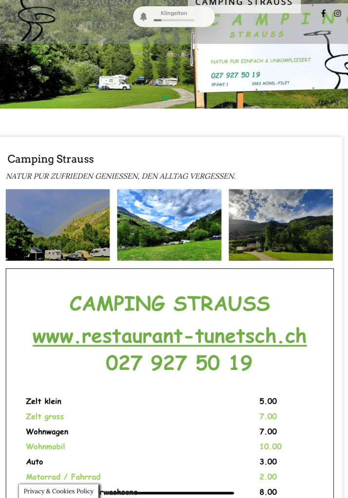 Der Sprung landete direkt auf dem Campingplatz Strauss. Wir steigen aus und „geimpft“ durch die Coronaerfahrungen von Chamonix-Mont-Blanc greifen wir zum Mund-Nasen-Schutz und fragen den Campingwirt, ob wir den brauchen. Seine Antwort: „Wenn ihr glaubt, dass es was nutzt, dann ja😜 Da waren wir uns doch gleich sympathisch 😀 Der Wirt betreibt zusammen mit seiner Frau den Campingplatz und gleichzeitig ihr Restaurant. Wir haben direkt am Abend bei ihnen gegessen: schweizer Haute-Cuisine. Das Restaurant war mit ca 30 Gästen komplett voll. Die beiden haben alles zur zweit gemacht: er die Küche, sie die Bedienung. Für uns, aber mehr als wahrscheinlich auch für die anderen, war es ein perfektes Dinner. Hut ab, wenn man das so schaffen kann: Campingplatz, Restaurant und 2 kleinere Kinder, und nie vermittelten die beiden einen Moment, Stress zu haben. Wunderschön, das zu erleben 😀