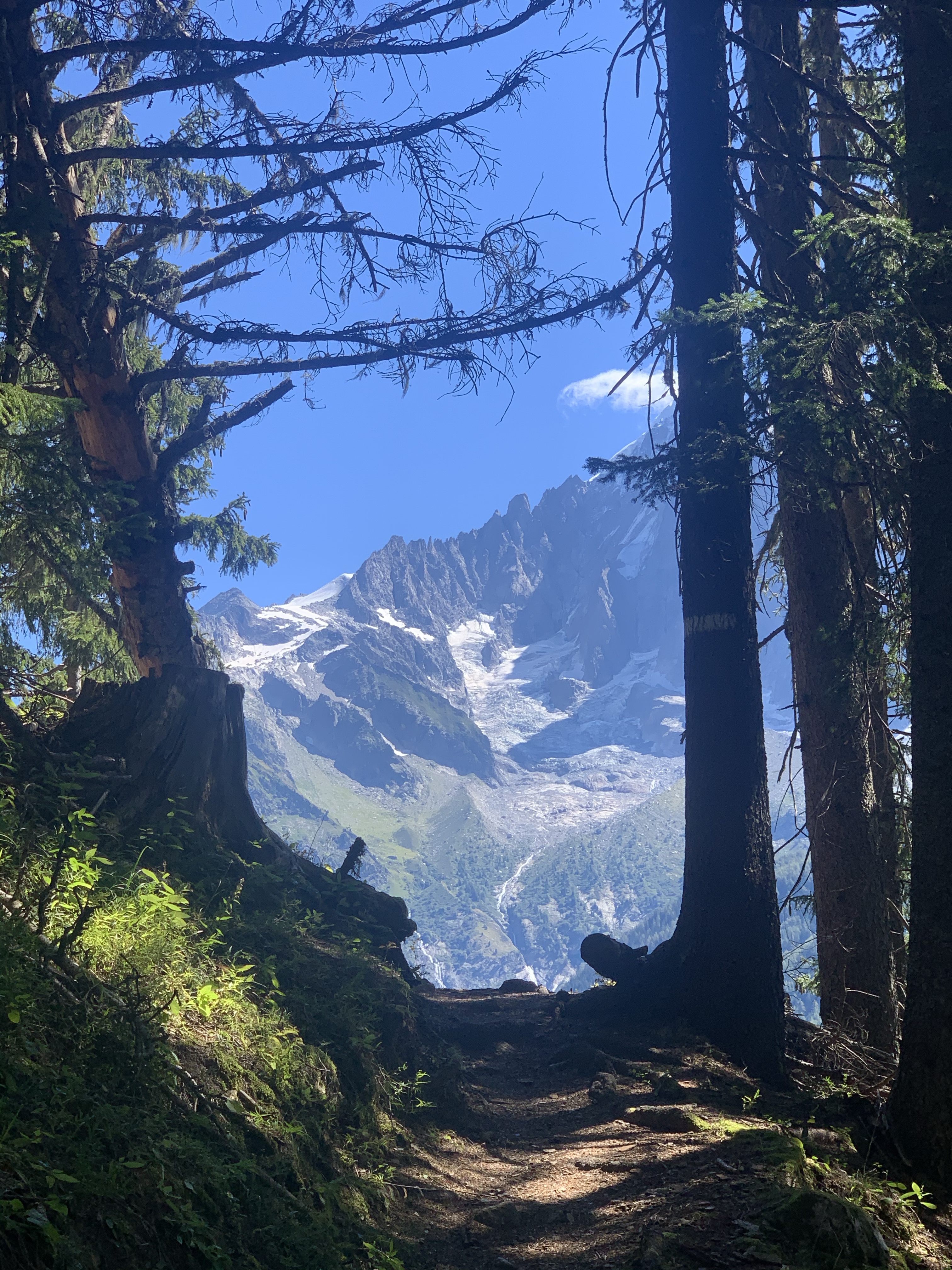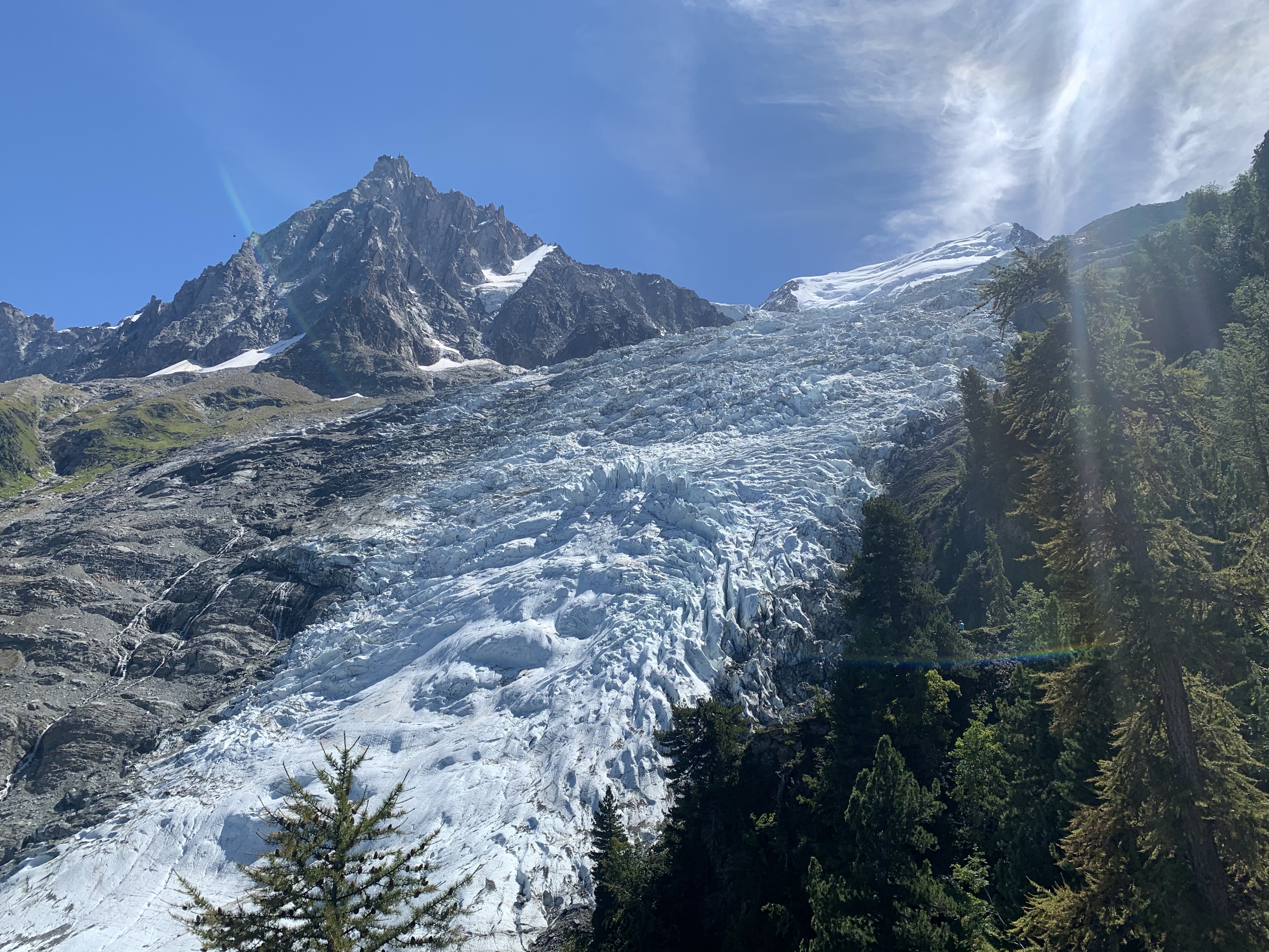Die erste Wanderung führte uns zum Glacier les Bossons. Eine wunderschöne Tour, die wir auf dem Campingplatz direkt starten können. Natürlich kann man mit dem Bus kostenlos zum Parkplatz an der Gondelbahn fahren, dann eine Gondel nehmen, da spart man sich einiges an Höhenmetern und Zeit. Zeit haben wir viel und Höhenmetern wollen wir sammeln, daher für uns keine Option. Bis zur ersten Hütte waren wir dementsprechend alleine unterwegs. Die erste Hütte ist gleichzeitig ein kleines Museum, wo Fundstücke eines Flugzeugabsturzes ausgestellt werden. Es sind die Überreste des Absturzes in 1966, die der Gletscher wieder freigibt. Schon sehr beeindruckend. Da hält man automatisch einen Moment inne und ist sich sehr bewusst, wie schnell alles vorbei sein kann.