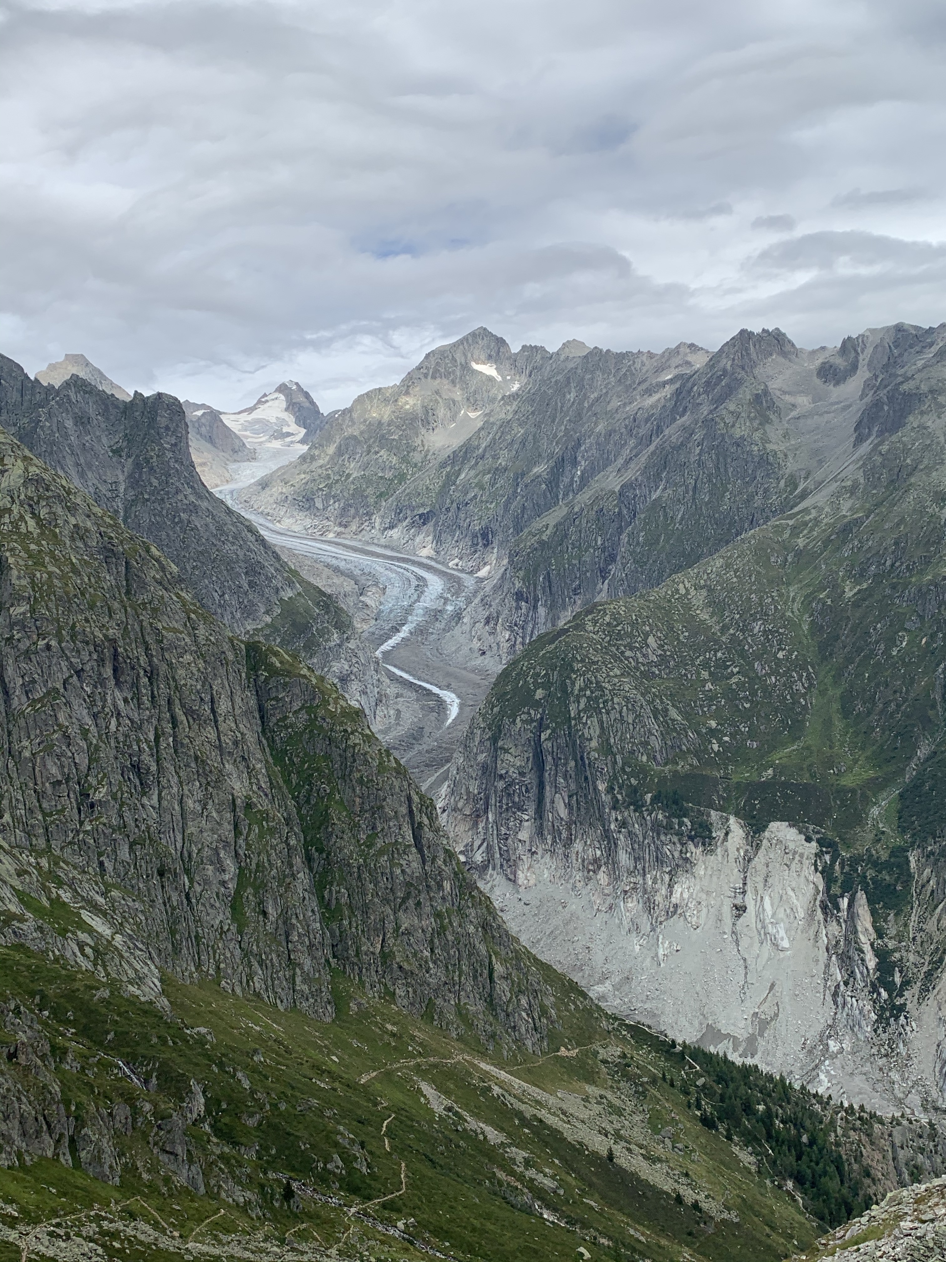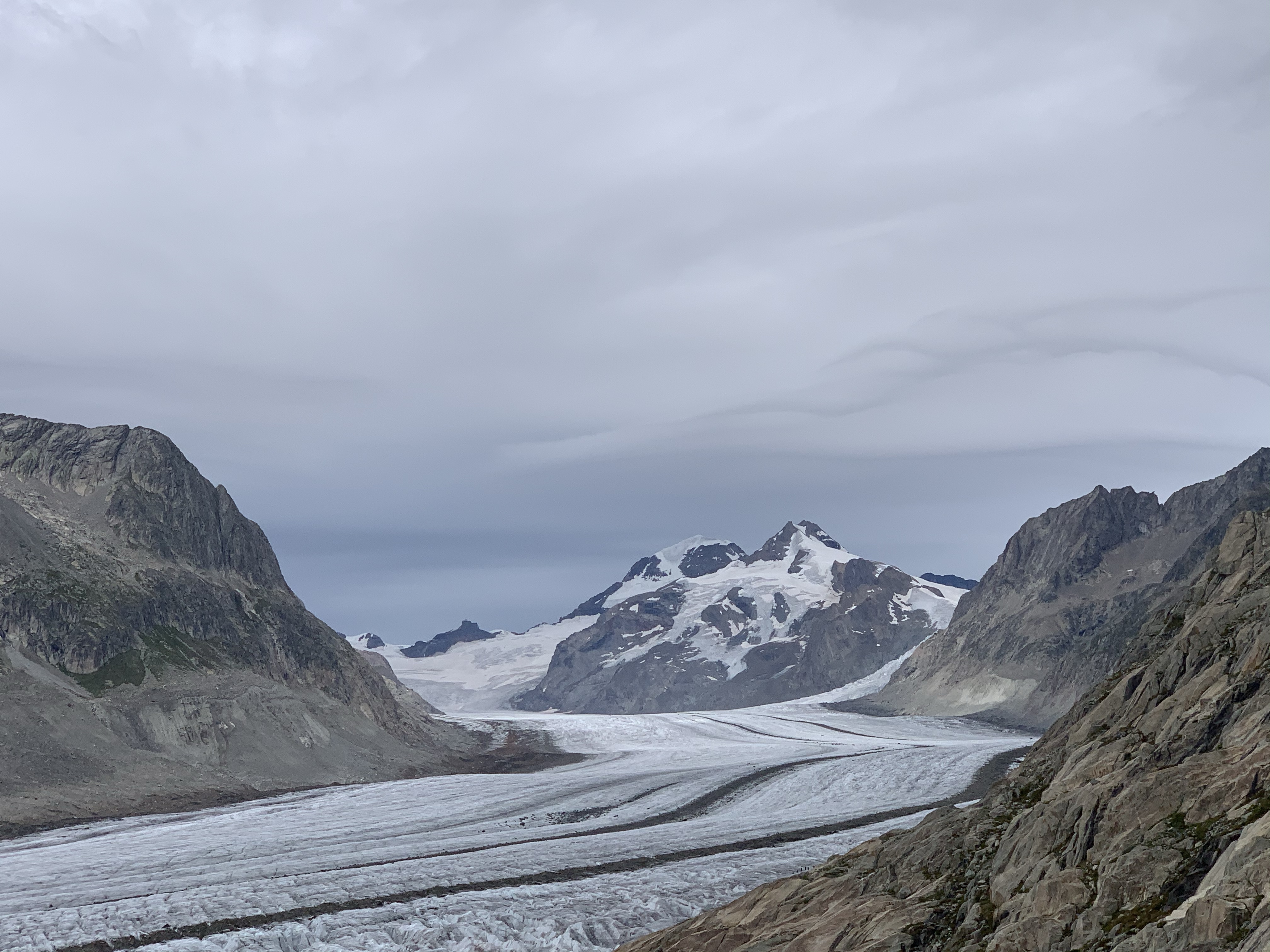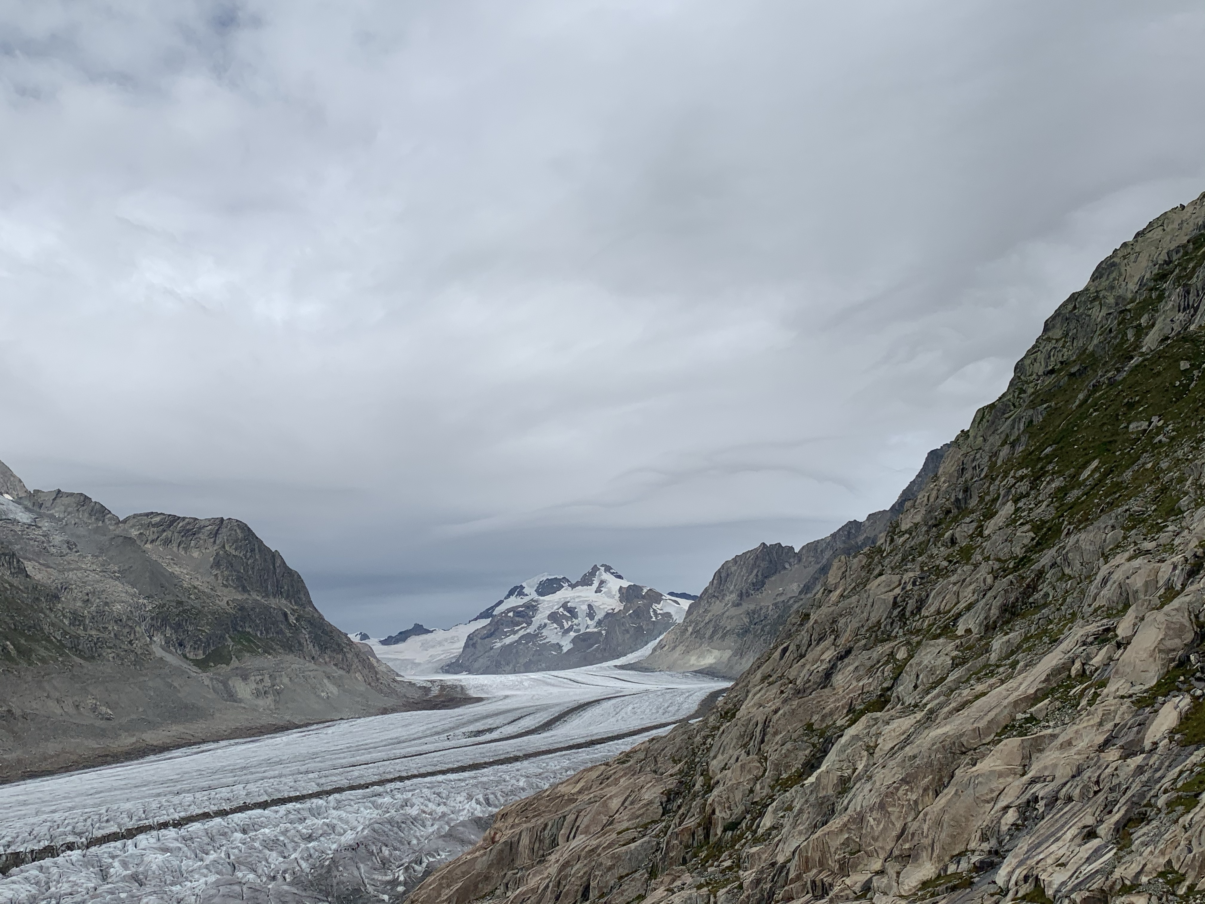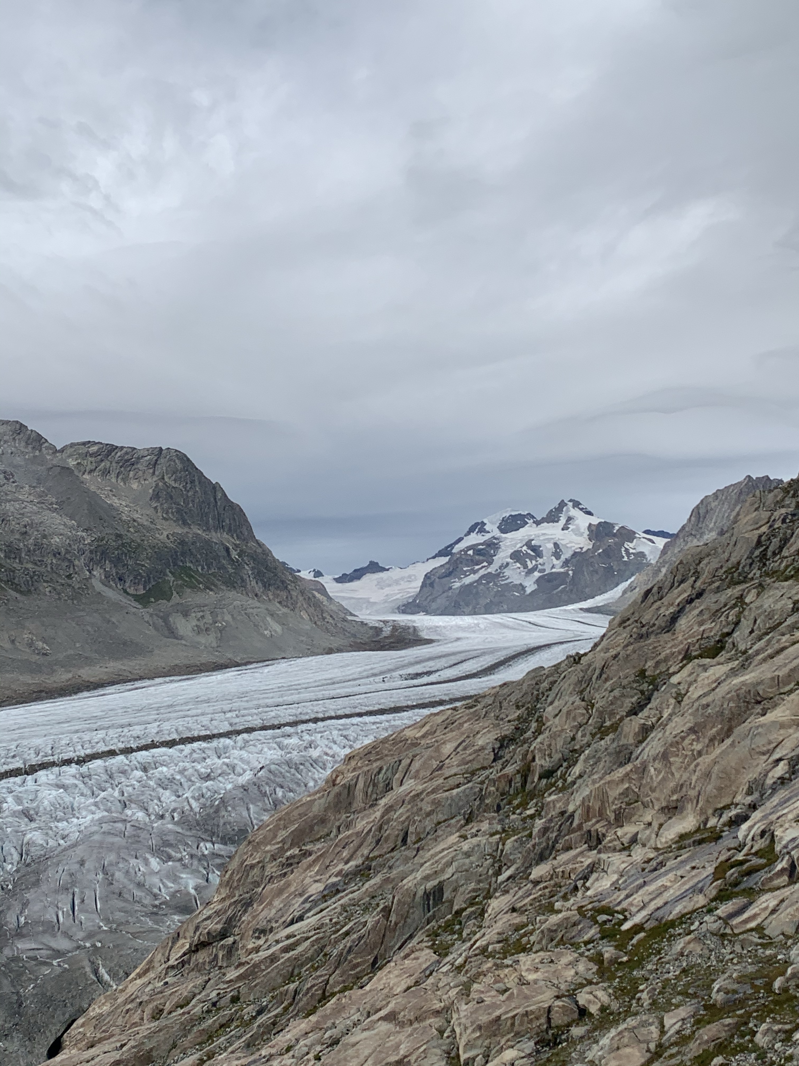 Wir gönnen uns eine kleine Stärkung und führen ein kurzes Gespräch mit den Tischnachbarn. Sie fanden die Stonemangeschichte ganz spannend, aber unser Sabbatical noch spannender ☺️ Wo man denn so was bekommt, wollte der Pensionär wissen und antwortete selber schon mal mit: „An der Hochschule“❓Wir haben es als Kompliment gesehen in Bezug auf unser jugendliches Aussehen 😇 Er hat uns dann noch den Tipp gegeben, einige Minuten herunter zu gehen, da hätte man einen wunderschönen Blick auf den Aletschgletscher.