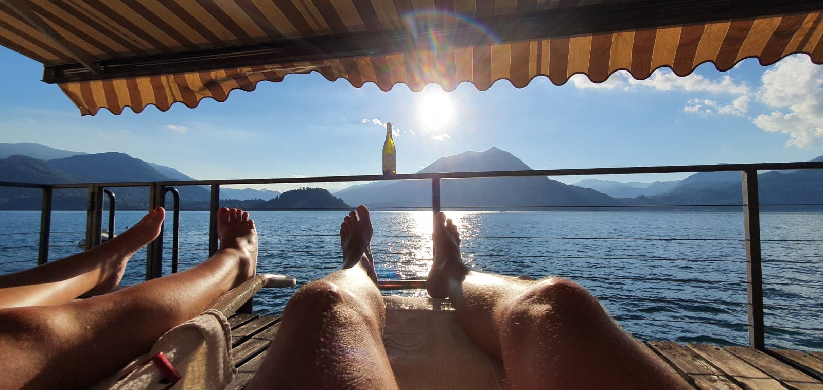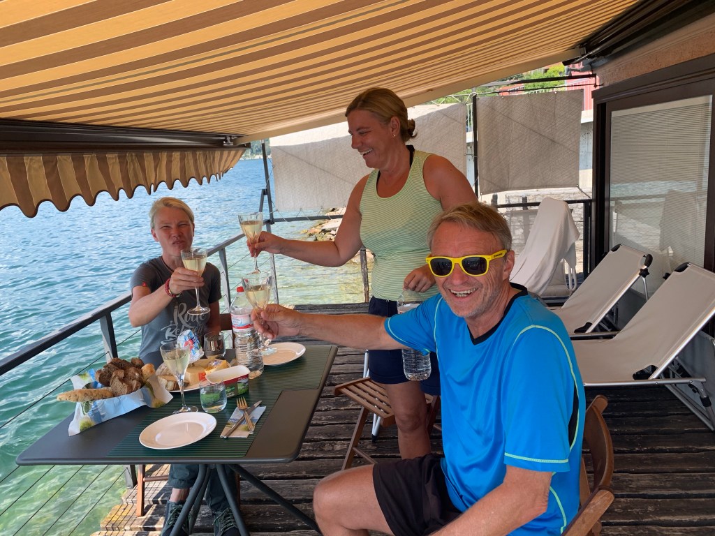 Nach eine paar Gläschen und Fingerfood haben wir noch ein wenig entspannt auf der Terrasse geplaudert und ausgeruht, um dann noch eine kleine Runde im See zu Schwimmen. Sigrid, die normalerweise die Fähigkeit hat, die Wassertemperatur sehen zu können, war sich aber beim Comersee nicht sicher. Das macht es für uns Frostbeulen natürlich nicht einfacher, wenn solche Fähigkeiten einen im Stich lassen 😉 Also haben wir diesmal auf gut Glück die Badehosen-Variante gewählt, getarnt mit Bademützen und Didi sogar mit der legendären John-Porno-Schwimmbrille 😎 Es war herrlich!