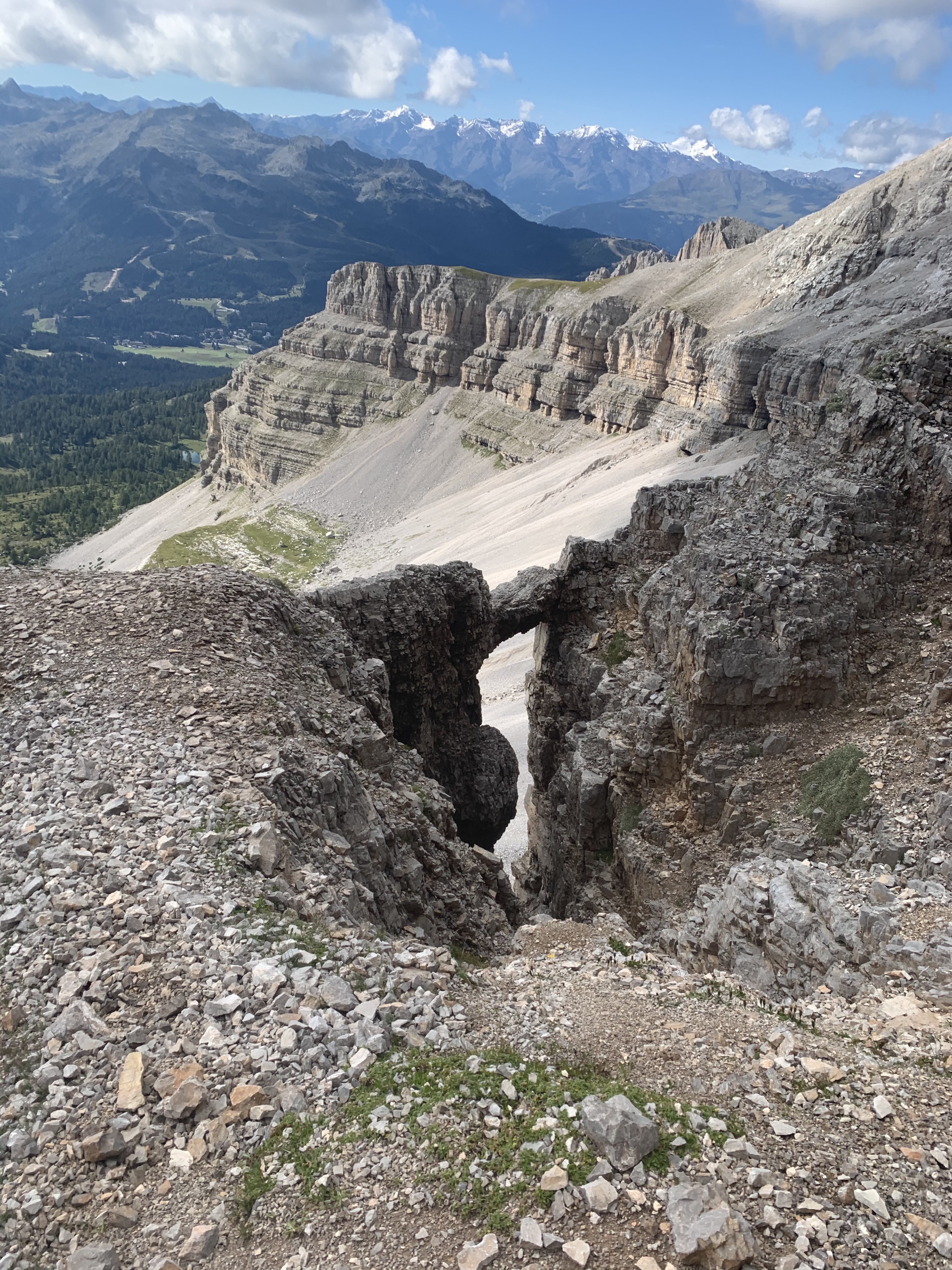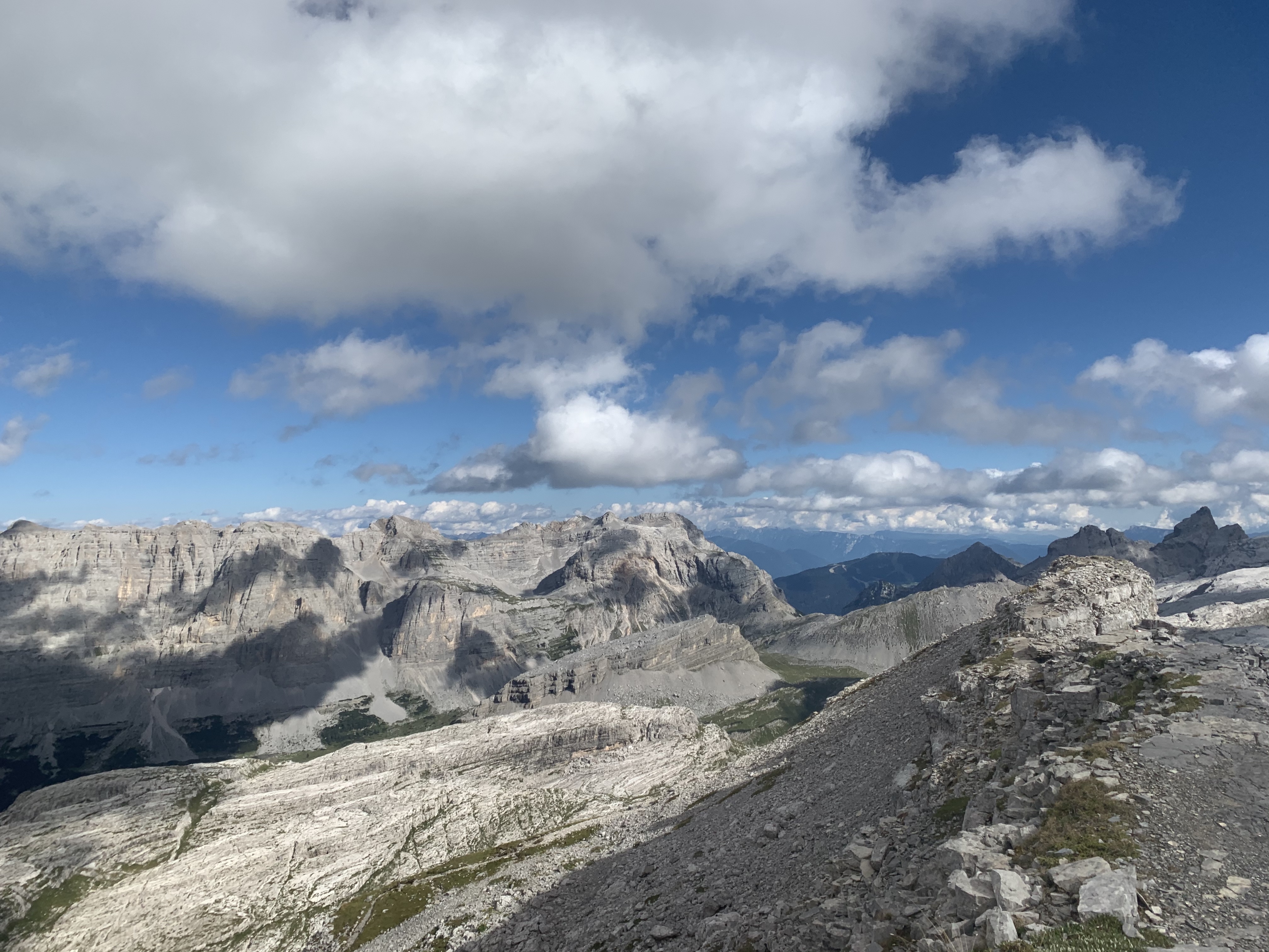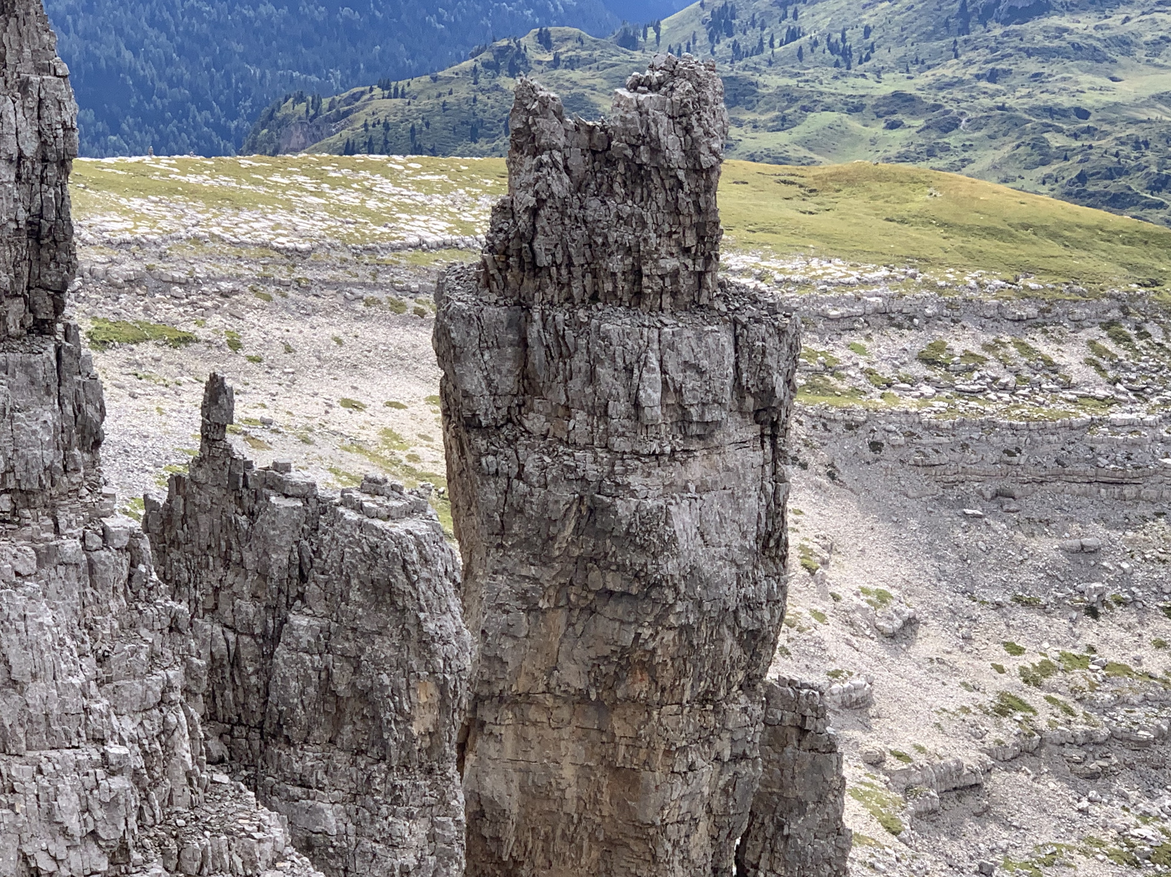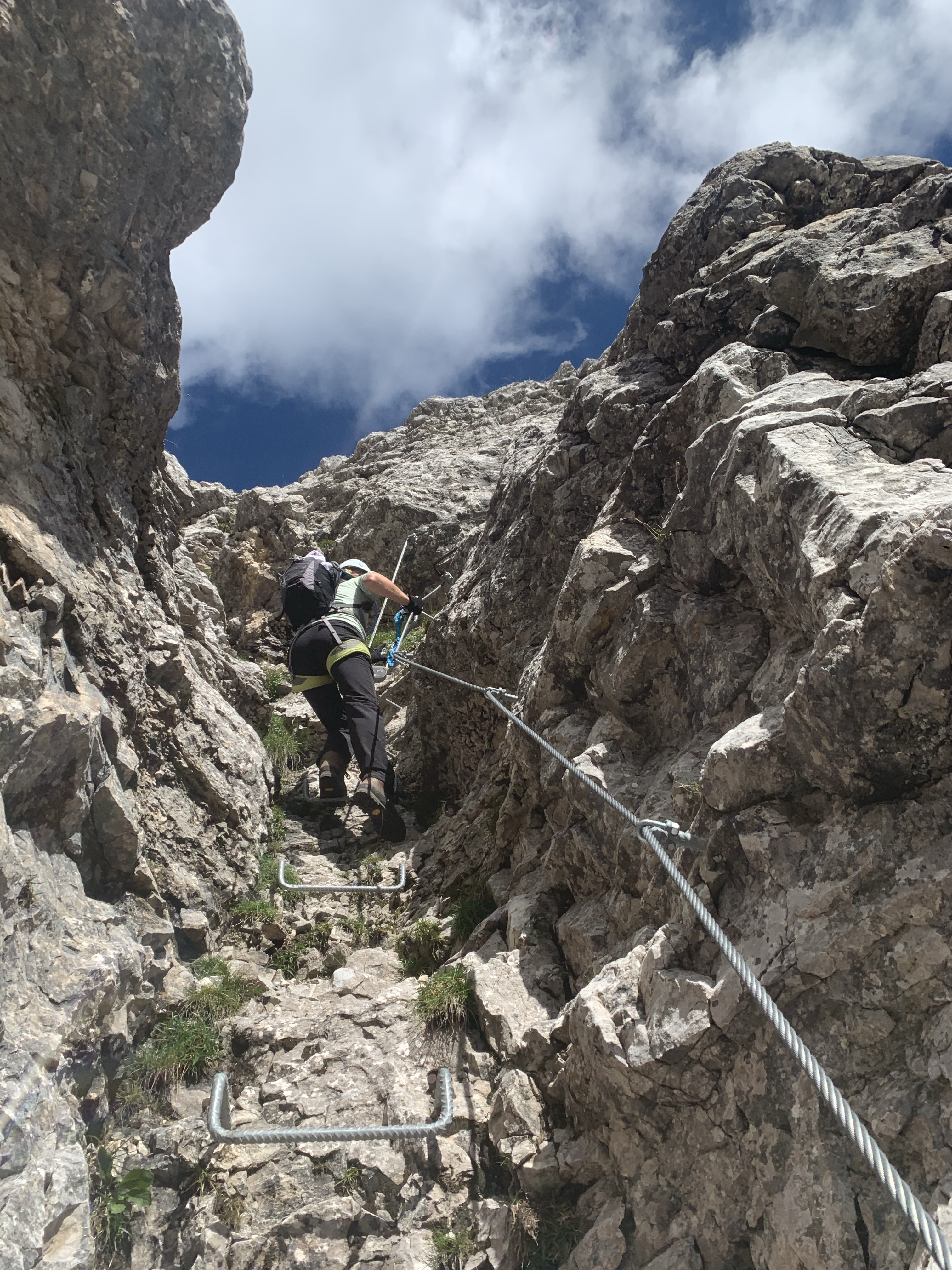 Der Klettersteig an sich war sehr kurz und ziemlich einfach, der Wanderweg war teilweise sehr steil mit abwechselnd grobem Schotter, Felsblöcken oder sehr feinem Kies, in dem man dann bei jedem dritten Schritt wieder einen herunterrutschte. Auf dem Rückweg sind wir dann über eine der waagerechten Kanten in den typischen Dolomitenstufen vom letzten Bild gewandert – schon eine sehr besondere Erfahrung 😀 Die Wanderung hat dann doch einige Zeit in Anspruch genommen und am Ende waren wir froh, dass wir eine der letzten Talfahrten noch erreicht haben. Sonst hätten wir doch womöglich noch in einer der vollbesetzten Hütten um Unterkunft bitten müssen 😅