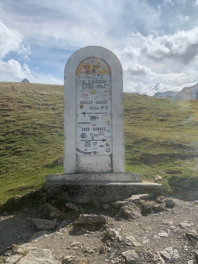 Als wir Gourette verlassen, wird die Vegetation karg und eine schöne Bergwelt öffnet sich vor uns. In der Ferne erahnen wir schon eine Hütte am Pass, da angekommen sehen wir, dass sie geschlossen ist und dass wir noch fast 1 1/2 Kilometer fahren dürfen bis wir ganz oben sind 😁