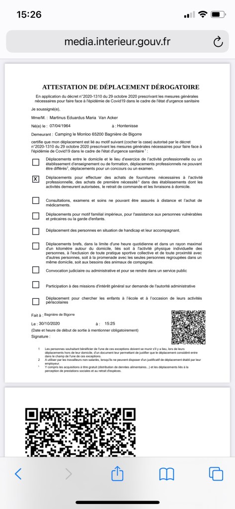 Präsident Macron hat am Mittwoch, 28.10.2020, verkündet, dass ab Freitag den 30.10.2020 die COVID-19 😷 Maßnahmen deutlich verschärft werden. Jetzt dürfen wir den Campingplatz nur noch zum Einkaufen verlassen. Dafür sollen wir eine Bescheinigung downloaden, ausfüllen und bei Aufforderung vorzeigen.