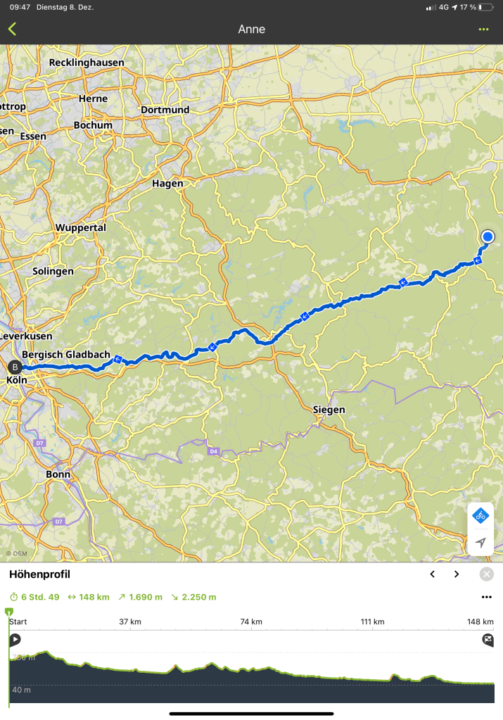 Alle Vorbereitungen getroffen, Rennräder fertig, Rucksäcke gepackt und am frühen Morgen geht‘s los. Es ist zwar frisch, aber die uns vertraute Strecke führt nach 2 Kilometer durch Grönebach und da darf man sich dann schon warm strampeln bei eine Steigung von 10%. Darauf folgt ein gemächlicher Anstieg, der durch Winterberg führt bis Altastenberg. Dann kommt eine etwas längere Abfahrt, die doch tatsächlich Erinnerungen an Alpenpässe aufkommen lässt. Weiter geht’s landschaftlich sehr schön an Westfeld, Oberhundem und Schmallenberg vorbei in Richtung Olpe. Die meisten Höhenmeter des Tages sind da schon abgestrampelt. Einen Kaffee und ein Leckerchen genießen und weiter. In der Nähe von Engelskirchen haben wir noch versucht, einer Dame mit ihrem MTB zu helfen. Sie hatte einen platten Hinterreifen und kam mit ihre Pumpe nicht klar. Auch wir haben es nicht geschafft und auch unser Werkzeug war für dieses Rad nicht passend. Nachdem wir ihr geraten haben, doch zur nächsten Tankstelle zu gehen, sind wir dann weiter gefahren. Der Weg lief schön an der Agger entlang, das Wetter war angenehm und es war nicht mehr ganz so weit. Optimal, um die letzten Kilometer schön locker zu Ende zu fahren 😁 Doch da hatte Komoot noch was anderes in Petto für uns: obwohl die Straße, auf der wir fuhren, die Kölnerstrasse war, sollen wir rechts abbiegen und nach Hohkeppel fahren. Hoh bedeutet hier unmissverständlich HOCH!! 120 Höhenmeter verteilt auf einen knappen Kilometer. Nicht „in the mood“ für sowas, bedeutet bei Martin…