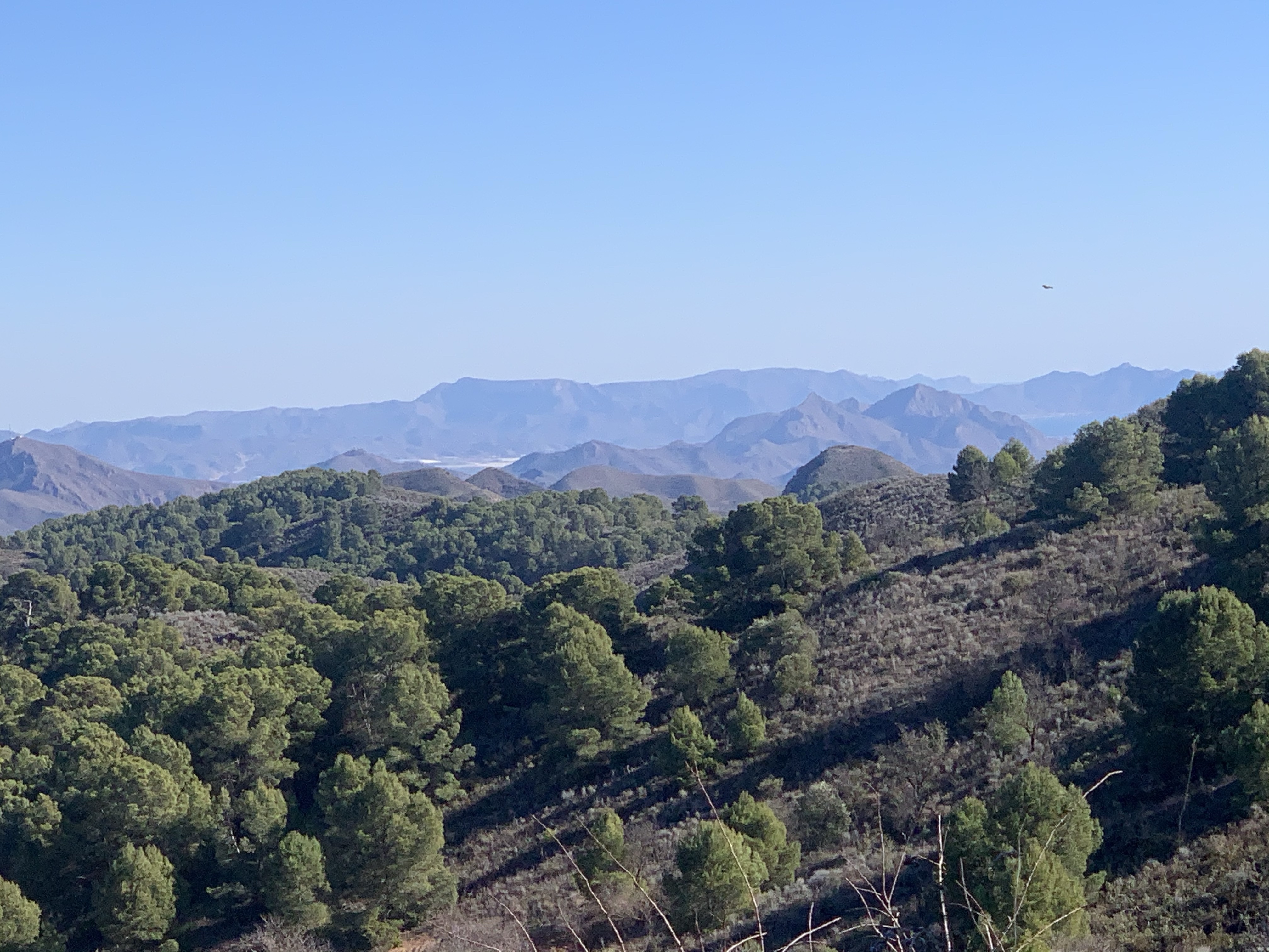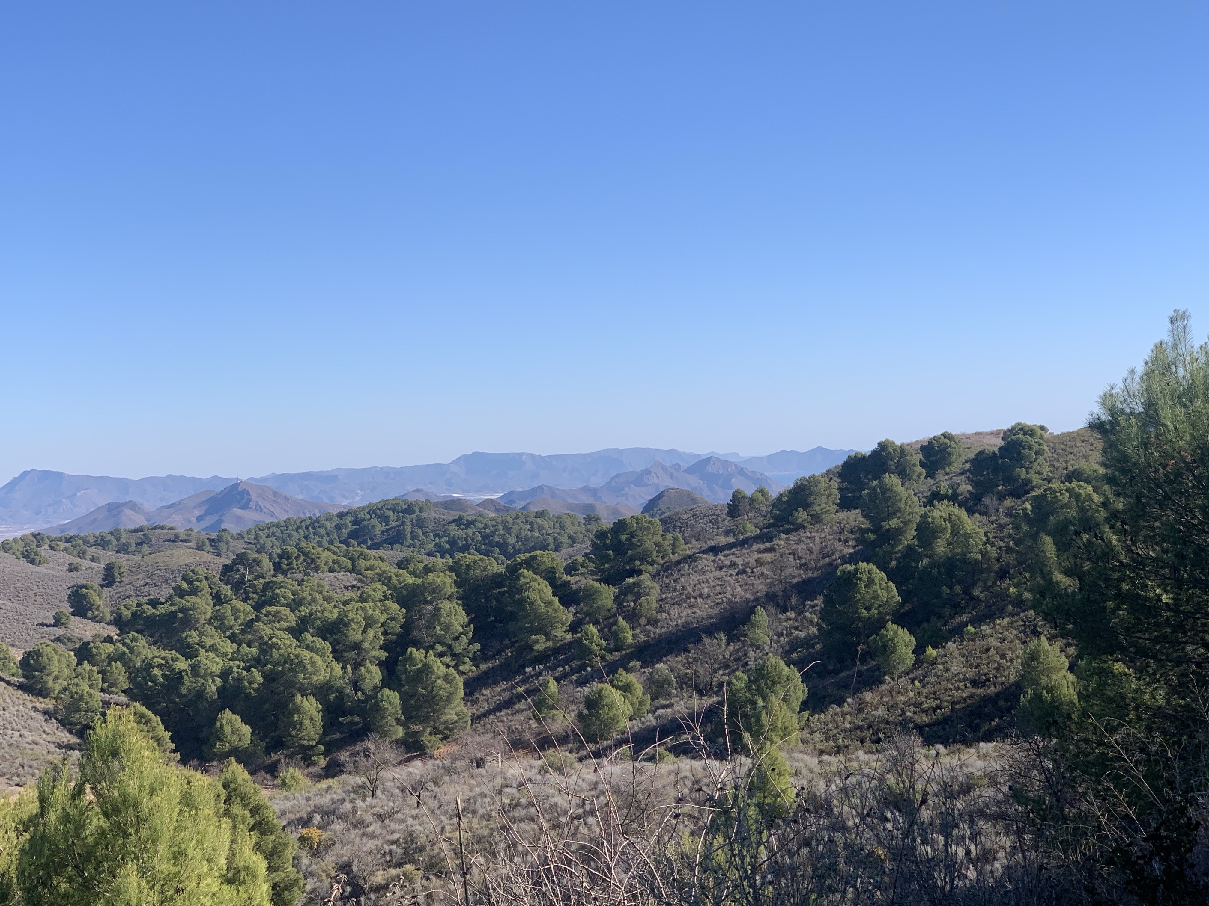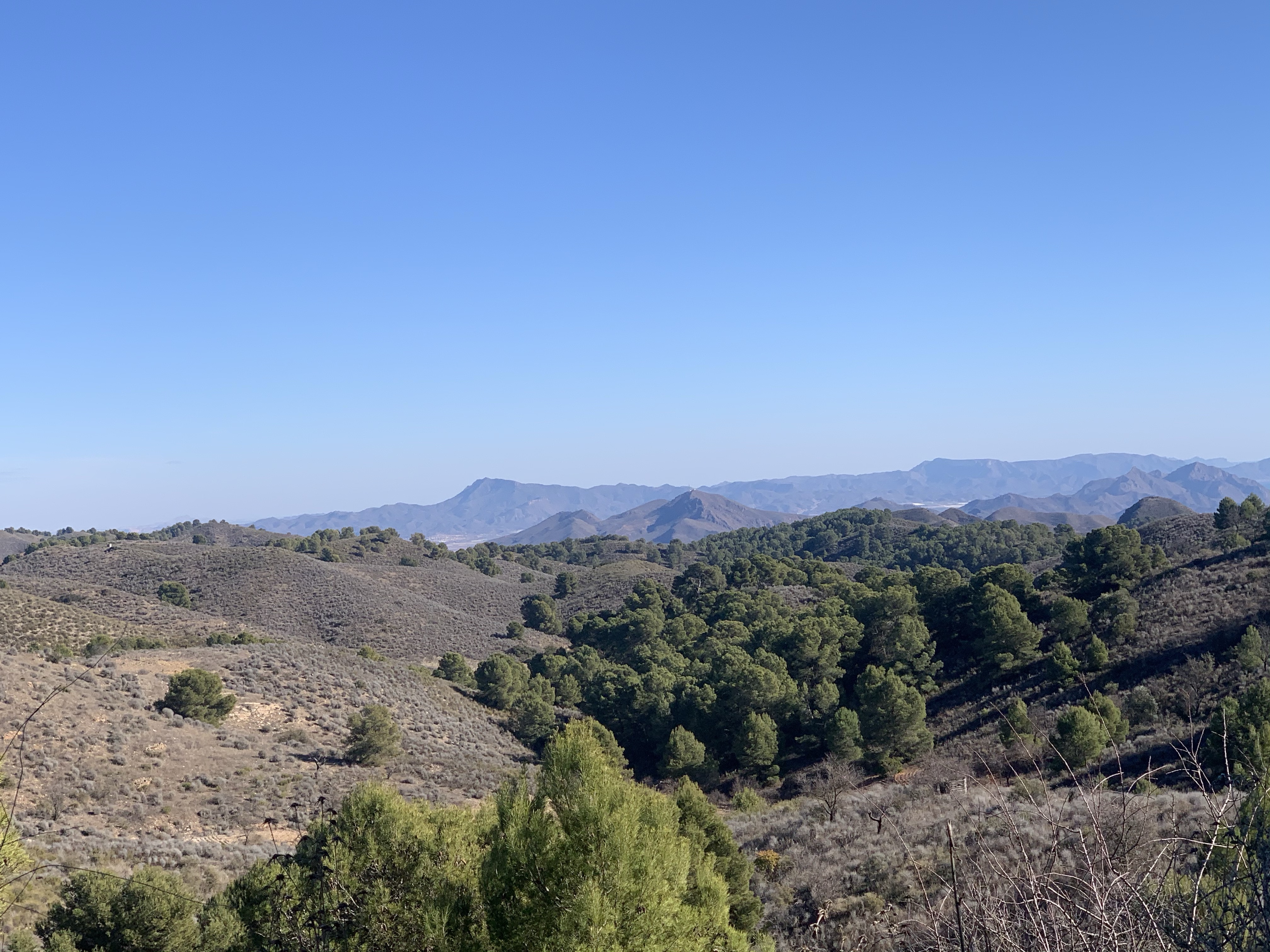 Wir dürfen aber relativ schnell einmal links abbiegen und ab da verlassen wir die Anbaugebiete und fahren dann in Richtung Mittelgebirge. Eine jetzt sehr abwechslungsreiche Umgebung öffnet sich vor uns. Wir fahren durch kleine Dörfer und steigen langsam aber stetig nach oben. Insgesamt sind es 32 Kilometer, die uns bis zum höchsten Punkt führen. Die karge Landschaft haben wir hinter uns gelassen und wir sind durch einen Pinienwald den Berg hinauf gefahren. Hier oben gibt es kleine Parzellen, wo sich Plantagen befinden. Schwer zu bearbeiten und schlecht zu erreichen, völlig konträr zu den Gewächshäusern.
