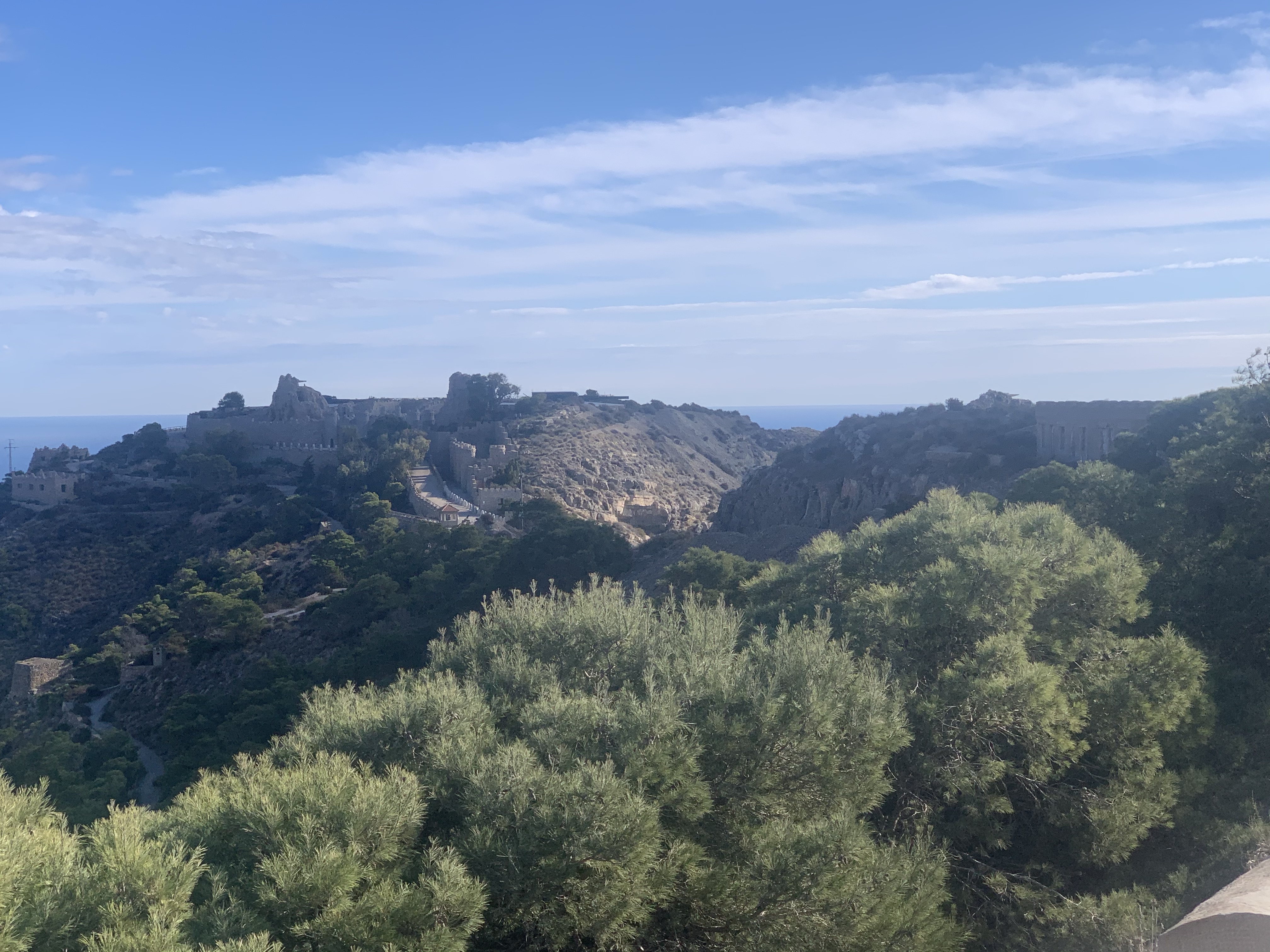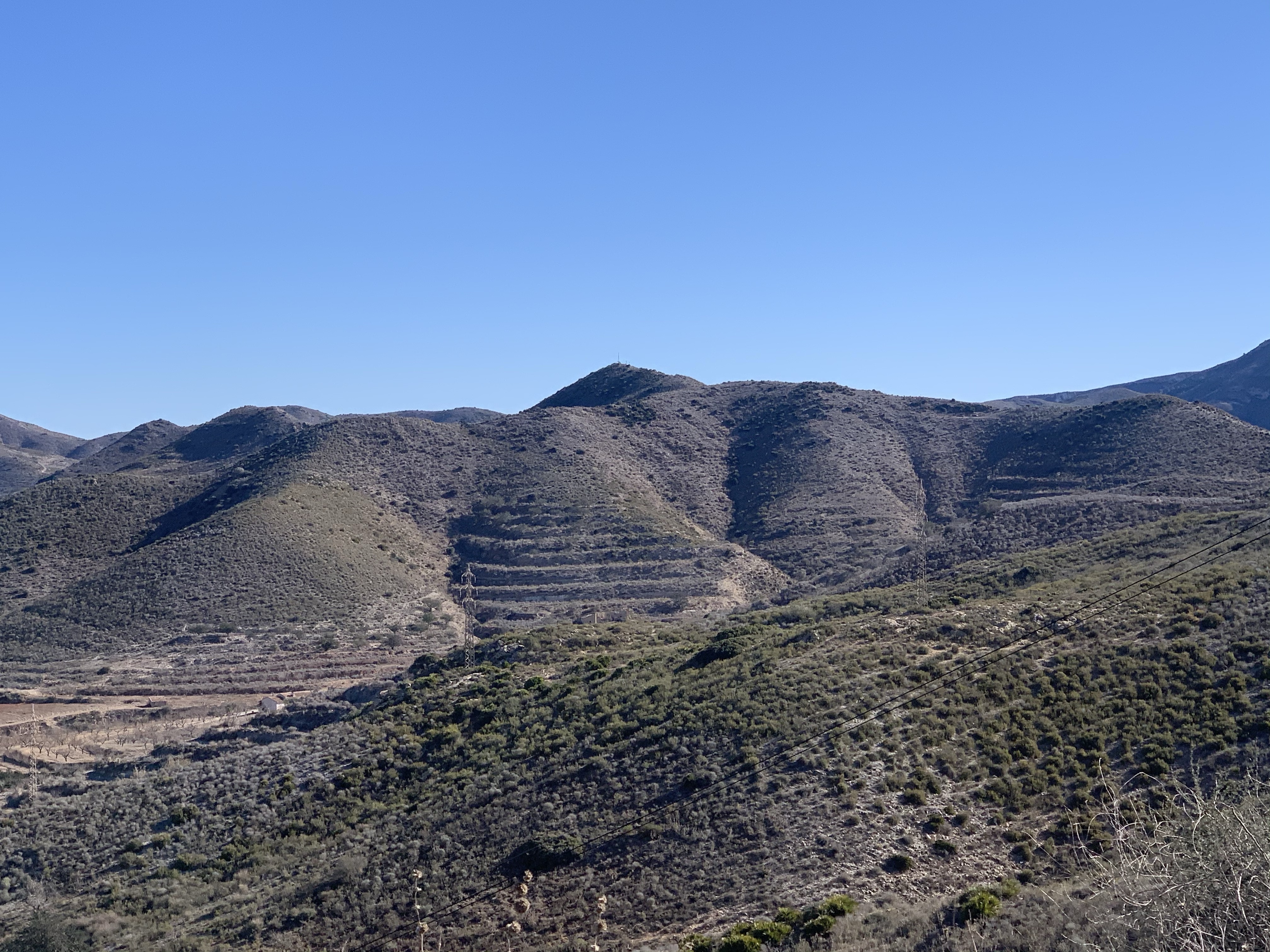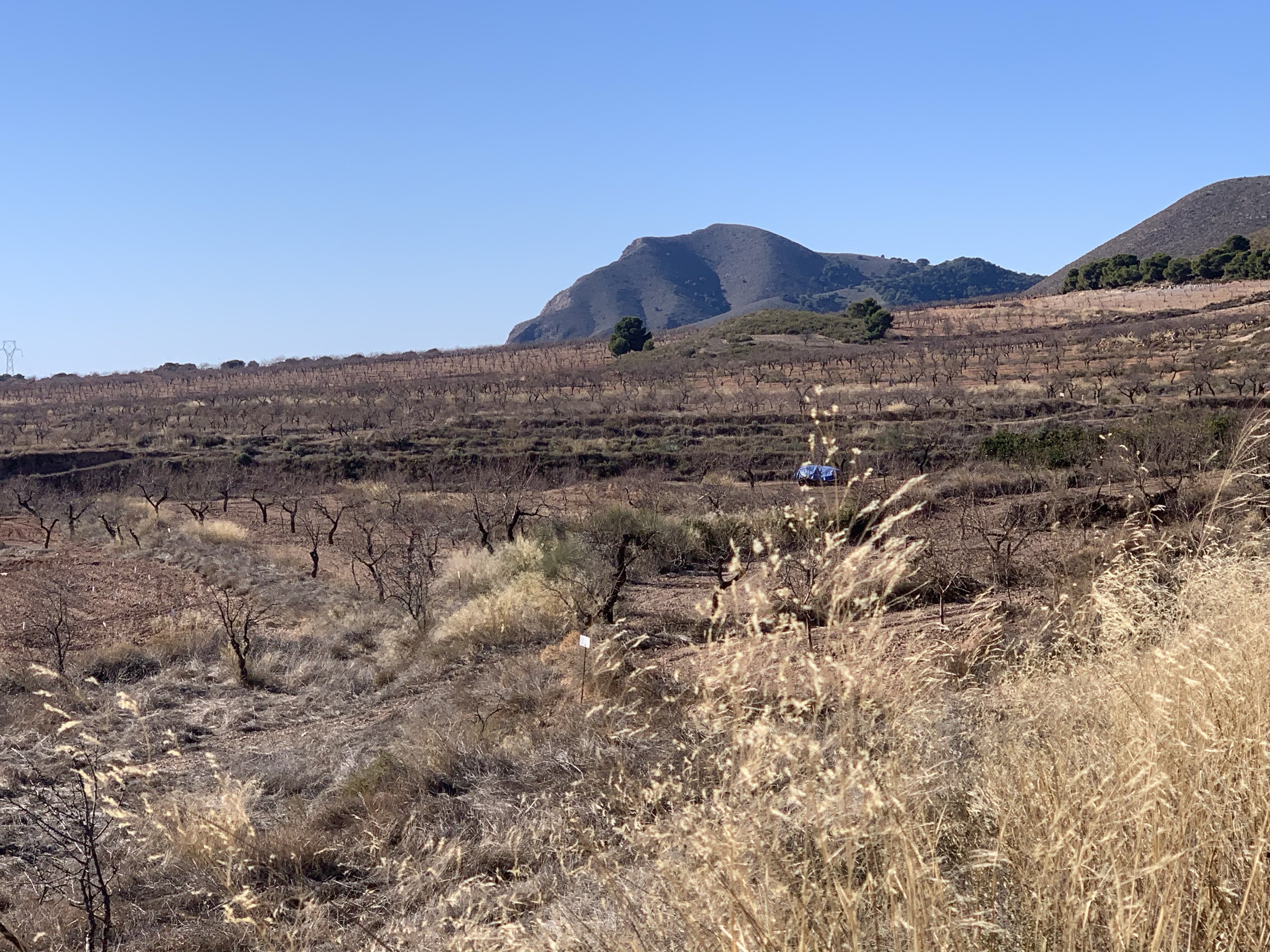 Wir dürfen aber relativ schnell einmal links abbiegen und ab da verlassen wir die Anbaugebiete und fahren dann in Richtung Mittelgebirge. Eine jetzt sehr abwechslungsreiche Umgebung öffnet sich vor uns. Wir fahren durch kleine Dörfer und steigen langsam aber stetig nach oben. Insgesamt sind es 32 Kilometer, die uns bis zum höchsten Punkt führen. Die karge Landschaft haben wir hinter uns gelassen und wir sind durch einen Pinienwald den Berg hinauf gefahren. Hier oben gibt es kleine Parzellen, wo sich Plantagen befinden. Schwer zu bearbeiten und schlecht zu erreichen, völlig konträr zu den Gewächshäusern.