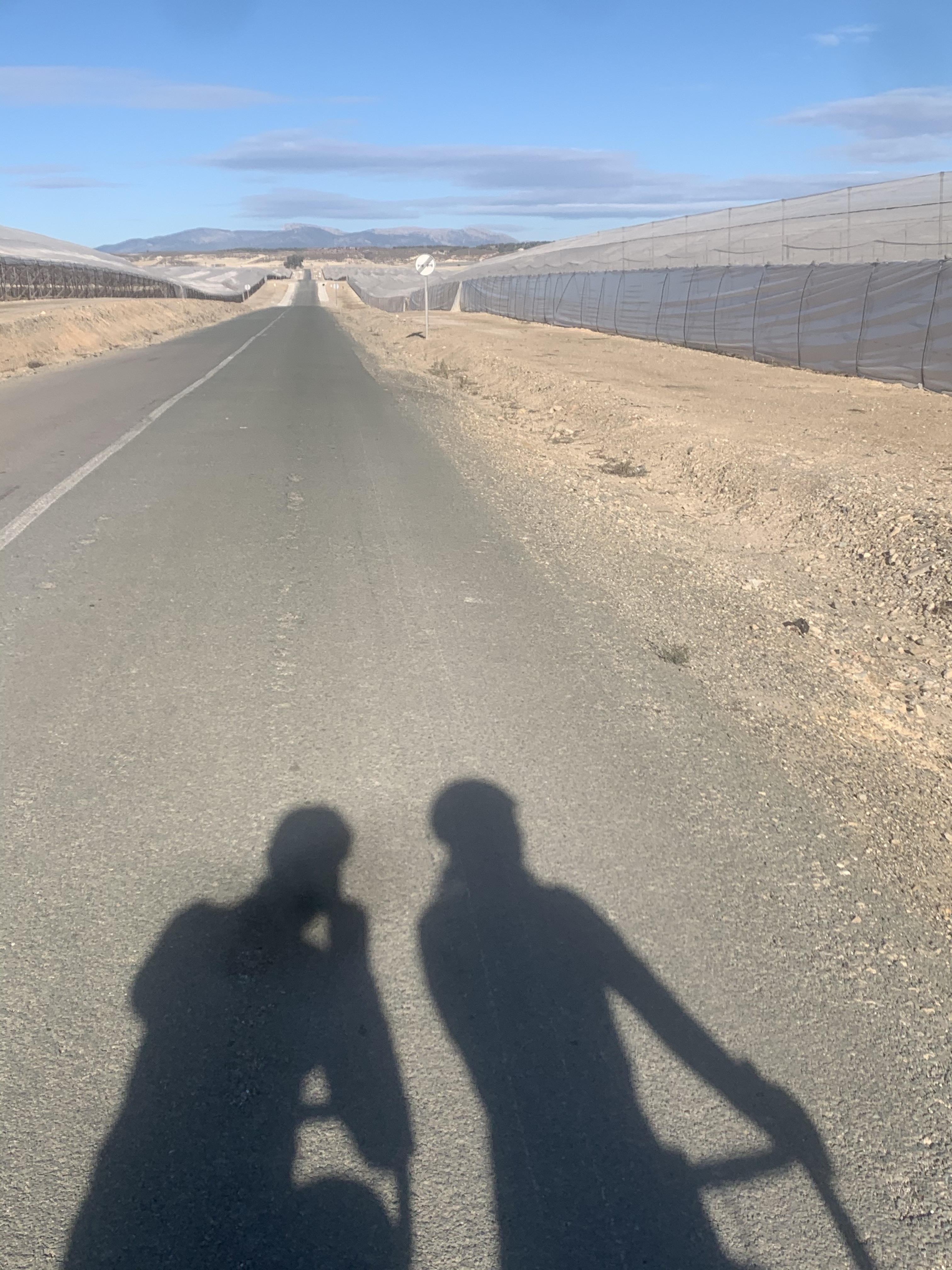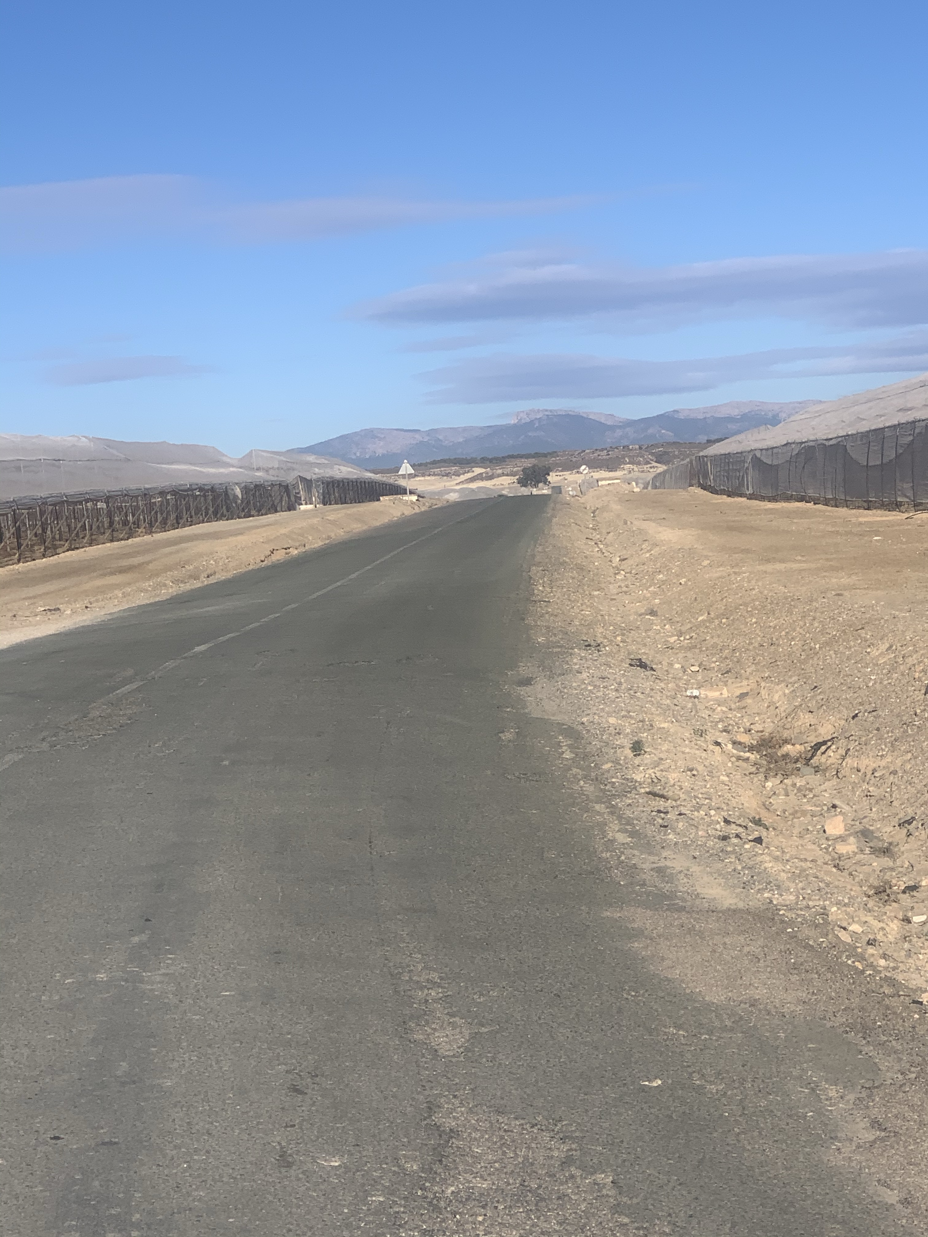 Bei schönstem Wetter sind wir den nächsten Tag aufgebrochen, um ein paar Höhenmeter zu machen. Die Streckenführung lief vom Campingplatz aus direkt ins wellige Hinterland. Eine besondere Gegend, die geprägt wird von riesigen Gewächshäusern, nicht so wie wir sie aus Deutschland oder die Niederlande kennen aus Glass, sondern mit Plastikfolien überspannt. Die Parzellen liegen links und rechts von den kilometerlangen geraden Straßen. Teilweise bestückt mit Schildern von Bayer Leverkusen. Seit COVID-19 durch die Welt zieht und Bayer wohl nicht an dem Impfstoff arbeitet, gehen sie in die Offensive und werben für eine natürliche Unterstützung bei der emotionalen Belastung in der Krise. Daher haben wir vollstes Vertrauen darin, dass da nur Gesundes wächst 😇